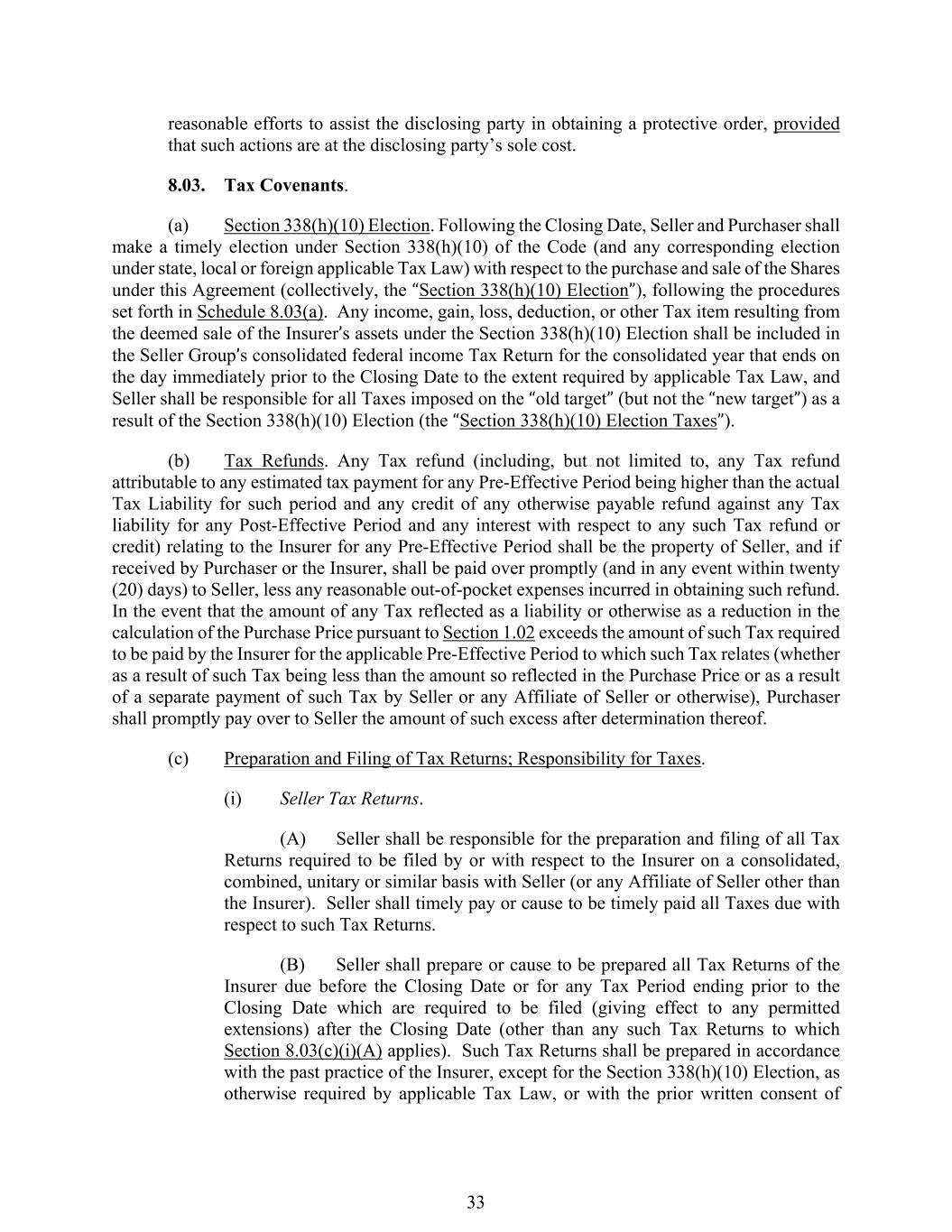 33 reasonable efforts to assist the disclosing party in obtaining a protective order, provided that such actions are at the disclosing party’s sole cost. 8.03. Tax Covenants. (a) Section 338(h)(10) Election. Following the Closing Date, Seller and Purchaser shall make a timely election under Section 338(h)(10) of the Code (and any corresponding election under state, local or foreign applicable Tax Law) with respect to the purchase and sale of the Shares under this Agreement (collectively, the “Section 338(h)(10) Election”), following the procedures set forth in Schedule 8.03(a). Any income, gain, loss, deduction, or other Tax item resulting from the deemed sale of the Insurer’s assets under the Section 338(h)(10) Election shall be included in the Seller Group’s consolidated federal income Tax Return for the consolidated year that ends on the day immediately prior to the Closing Date to the extent required by applicable Tax Law, and Seller shall be responsible for all Taxes imposed on the “old target” (but not the “new target”) as a result of the Section 338(h)(10) Election (the “Section 338(h)(10) Election Taxes”). (b) Tax Refunds. Any Tax refund (including, but not limited to, any Tax refund attributable to any estimated tax payment for any Pre-Effective Period being higher than the actual Tax Liability for such period and any credit of any otherwise payable refund against any Tax liability for any Post-Effective Period and any interest with respect to any such Tax refund or credit) relating to the Insurer for any Pre-Effective Period shall be the property of Seller, and if received by Purchaser or the Insurer, shall be paid over promptly (and in any event within twenty (20) days) to Seller, less any reasonable out-of-pocket expenses incurred in obtaining such refund. In the event that the amount of any Tax reflected as a liability or otherwise as a reduction in the calculation of the Purchase Price pursuant to Section 1.02 exceeds the amount of such Tax required to be paid by the Insurer for the applicable Pre-Effective Period to which such Tax relates (whether as a result of such Tax being less than the amount so reflected in the Purchase Price or as a result of a separate payment of such Tax by Seller or any Affiliate of Seller or otherwise), Purchaser shall promptly pay over to Seller the amount of such excess after determination thereof. (c) Preparation and Filing of Tax Returns; Responsibility for Taxes. (i) Seller Tax Returns. (A) Seller shall be responsible for the preparation and filing of all Tax Returns required to be filed by or with respect to the Insurer on a consolidated, combined, unitary or similar basis with Seller (or any Affiliate of Seller other than the Insurer). Seller shall timely pay or cause to be timely paid all Taxes due with respect to such Tax Returns. (B) Seller shall prepare or cause to be prepared all Tax Returns of the Insurer due before the Closing Date or for any Tax Period ending prior to the Closing Date which are required to be filed (giving effect to any permitted extensions) after the Closing Date (other than any such Tax Returns to which Section 8.03(c)(i)(A) applies). Such Tax Returns shall be prepared in accordance with the past practice of the Insurer, except for the Section 338(h)(10) Election, as otherwise required by applicable Tax Law, or with the prior written consent of