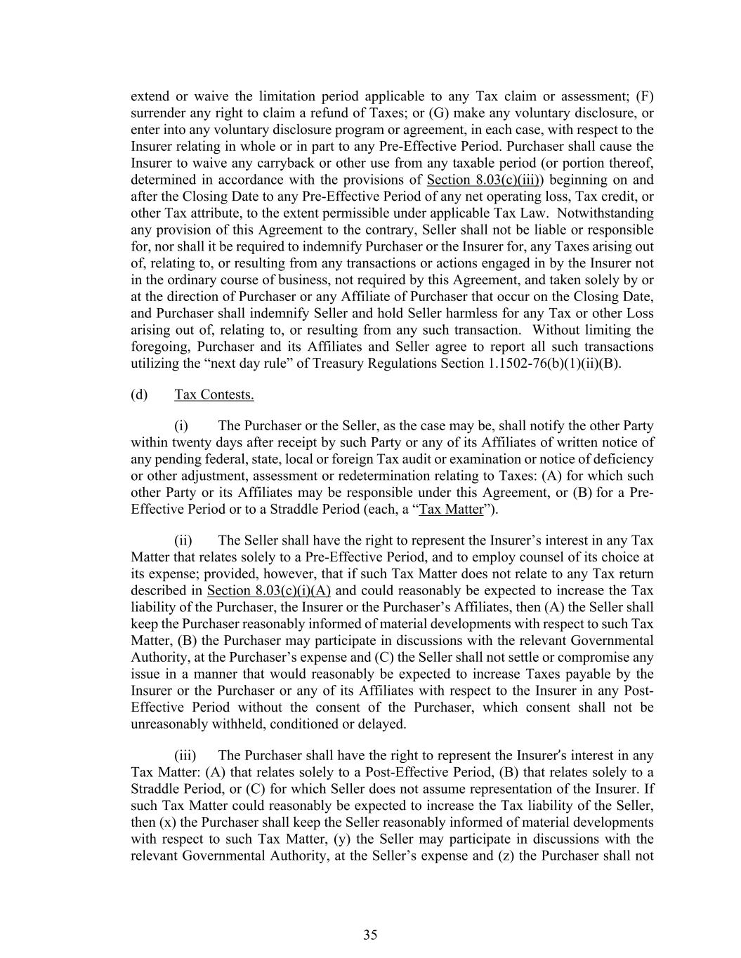 35 extend or waive the limitation period applicable to any Tax claim or assessment; (F) surrender any right to claim a refund of Taxes; or (G) make any voluntary disclosure, or enter into any voluntary disclosure program or agreement, in each case, with respect to the Insurer relating in whole or in part to any Pre-Effective Period. Purchaser shall cause the Insurer to waive any carryback or other use from any taxable period (or portion thereof, determined in accordance with the provisions of Section 8.03(c)(iii)) beginning on and after the Closing Date to any Pre-Effective Period of any net operating loss, Tax credit, or other Tax attribute, to the extent permissible under applicable Tax Law. Notwithstanding any provision of this Agreement to the contrary, Seller shall not be liable or responsible for, nor shall it be required to indemnify Purchaser or the Insurer for, any Taxes arising out of, relating to, or resulting from any transactions or actions engaged in by the Insurer not in the ordinary course of business, not required by this Agreement, and taken solely by or at the direction of Purchaser or any Affiliate of Purchaser that occur on the Closing Date, and Purchaser shall indemnify Seller and hold Seller harmless for any Tax or other Loss arising out of, relating to, or resulting from any such transaction. Without limiting the foregoing, Purchaser and its Affiliates and Seller agree to report all such transactions utilizing the “next day rule” of Treasury Regulations Section 1.1502-76(b)(1)(ii)(B). (d) Tax Contests. (i) The Purchaser or the Seller, as the case may be, shall notify the other Party within twenty days after receipt by such Party or any of its Affiliates of written notice of any pending federal, state, local or foreign Tax audit or examination or notice of deficiency or other adjustment, assessment or redetermination relating to Taxes: (A) for which such other Party or its Affiliates may be responsible under this Agreement, or (B) for a Pre- Effective Period or to a Straddle Period (each, a “Tax Matter”). (ii) The Seller shall have the right to represent the Insurer’s interest in any Tax Matter that relates solely to a Pre-Effective Period, and to employ counsel of its choice at its expense; provided, however, that if such Tax Matter does not relate to any Tax return described in Section 8.03(c)(i)(A) and could reasonably be expected to increase the Tax liability of the Purchaser, the Insurer or the Purchaser’s Affiliates, then (A) the Seller shall keep the Purchaser reasonably informed of material developments with respect to such Tax Matter, (B) the Purchaser may participate in discussions with the relevant Governmental Authority, at the Purchaser’s expense and (C) the Seller shall not settle or compromise any issue in a manner that would reasonably be expected to increase Taxes payable by the Insurer or the Purchaser or any of its Affiliates with respect to the Insurer in any Post- Effective Period without the consent of the Purchaser, which consent shall not be unreasonably withheld, conditioned or delayed. (iii) The Purchaser shall have the right to represent the Insurer’s interest in any Tax Matter: (A) that relates solely to a Post-Effective Period, (B) that relates solely to a Straddle Period, or (C) for which Seller does not assume representation of the Insurer. If such Tax Matter could reasonably be expected to increase the Tax liability of the Seller, then (x) the Purchaser shall keep the Seller reasonably informed of material developments with respect to such Tax Matter, (y) the Seller may participate in discussions with the relevant Governmental Authority, at the Seller’s expense and (z) the Purchaser shall not