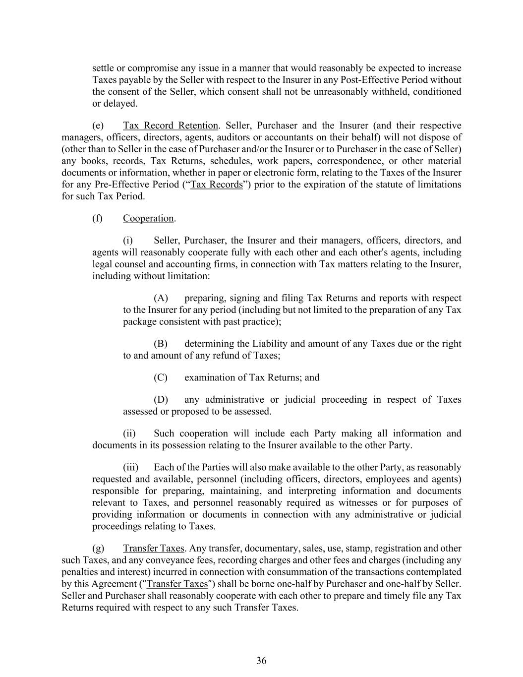 36 settle or compromise any issue in a manner that would reasonably be expected to increase Taxes payable by the Seller with respect to the Insurer in any Post-Effective Period without the consent of the Seller, which consent shall not be unreasonably withheld, conditioned or delayed. (e) Tax Record Retention. Seller, Purchaser and the Insurer (and their respective managers, officers, directors, agents, auditors or accountants on their behalf) will not dispose of (other than to Seller in the case of Purchaser and/or the Insurer or to Purchaser in the case of Seller) any books, records, Tax Returns, schedules, work papers, correspondence, or other material documents or information, whether in paper or electronic form, relating to the Taxes of the Insurer for any Pre-Effective Period (“Tax Records”) prior to the expiration of the statute of limitations for such Tax Period. (f) Cooperation. (i) Seller, Purchaser, the Insurer and their managers, officers, directors, and agents will reasonably cooperate fully with each other and each other’s agents, including legal counsel and accounting firms, in connection with Tax matters relating to the Insurer, including without limitation: (A) preparing, signing and filing Tax Returns and reports with respect to the Insurer for any period (including but not limited to the preparation of any Tax package consistent with past practice); (B) determining the Liability and amount of any Taxes due or the right to and amount of any refund of Taxes; (C) examination of Tax Returns; and (D) any administrative or judicial proceeding in respect of Taxes assessed or proposed to be assessed. (ii) Such cooperation will include each Party making all information and documents in its possession relating to the Insurer available to the other Party. (iii) Each of the Parties will also make available to the other Party, as reasonably requested and available, personnel (including officers, directors, employees and agents) responsible for preparing, maintaining, and interpreting information and documents relevant to Taxes, and personnel reasonably required as witnesses or for purposes of providing information or documents in connection with any administrative or judicial proceedings relating to Taxes. (g) Transfer Taxes. Any transfer, documentary, sales, use, stamp, registration and other such Taxes, and any conveyance fees, recording charges and other fees and charges (including any penalties and interest) incurred in connection with consummation of the transactions contemplated by this Agreement (“Transfer Taxes”) shall be borne one-half by Purchaser and one-half by Seller. Seller and Purchaser shall reasonably cooperate with each other to prepare and timely file any Tax Returns required with respect to any such Transfer Taxes.