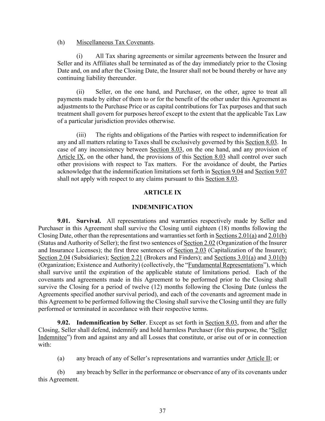 37 (h) Miscellaneous Tax Covenants. (i) All Tax sharing agreements or similar agreements between the Insurer and Seller and its Affiliates shall be terminated as of the day immediately prior to the Closing Date and, on and after the Closing Date, the Insurer shall not be bound thereby or have any continuing liability thereunder. (ii) Seller, on the one hand, and Purchaser, on the other, agree to treat all payments made by either of them to or for the benefit of the other under this Agreement as adjustments to the Purchase Price or as capital contributions for Tax purposes and that such treatment shall govern for purposes hereof except to the extent that the applicable Tax Law of a particular jurisdiction provides otherwise. (iii) The rights and obligations of the Parties with respect to indemnification for any and all matters relating to Taxes shall be exclusively governed by this Section 8.03. In case of any inconsistency between Section 8.03, on the one hand, and any provision of Article IX, on the other hand, the provisions of this Section 8.03 shall control over such other provisions with respect to Tax matters. For the avoidance of doubt, the Parties acknowledge that the indemnification limitations set forth in Section 9.04 and Section 9.07 shall not apply with respect to any claims pursuant to this Section 8.03. ARTICLE IX INDEMNIFICATION 9.01. Survival. All representations and warranties respectively made by Seller and Purchaser in this Agreement shall survive the Closing until eighteen (18) months following the Closing Date, other than the representations and warranties set forth in Sections 2.01(a) and 2.01(b) (Status and Authority of Seller); the first two sentences of Section 2.02 (Organization of the Insurer and Insurance Licenses); the first three sentences of Section 2.03 (Capitalization of the Insurer); Section 2.04 (Subsidiaries); Section 2.21 (Brokers and Finders); and Sections 3.01(a) and 3.01(b) (Organization; Existence and Authority) (collectively, the “Fundamental Representations”), which shall survive until the expiration of the applicable statute of limitations period. Each of the covenants and agreements made in this Agreement to be performed prior to the Closing shall survive the Closing for a period of twelve (12) months following the Closing Date (unless the Agreements specified another survival period), and each of the covenants and agreement made in this Agreement to be performed following the Closing shall survive the Closing until they are fully performed or terminated in accordance with their respective terms. 9.02. Indemnification by Seller. Except as set forth in Section 8.03, from and after the Closing, Seller shall defend, indemnify and hold harmless Purchaser (for this purpose, the “Seller Indemnitee”) from and against any and all Losses that constitute, or arise out of or in connection with: (a) any breach of any of Seller’s representations and warranties under Article II; or (b) any breach by Seller in the performance or observance of any of its covenants under this Agreement.