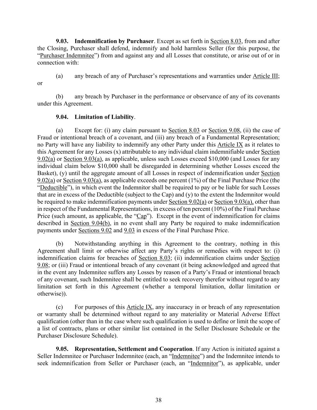 38 9.03. Indemnification by Purchaser. Except as set forth in Section 8.03, from and after the Closing, Purchaser shall defend, indemnify and hold harmless Seller (for this purpose, the “Purchaser Indemnitee”) from and against any and all Losses that constitute, or arise out of or in connection with: (a) any breach of any of Purchaser’s representations and warranties under Article III; or (b) any breach by Purchaser in the performance or observance of any of its covenants under this Agreement. 9.04. Limitation of Liability. (a) Except for: (i) any claim pursuant to Section 8.03 or Section 9.08, (ii) the case of Fraud or intentional breach of a covenant, and (iii) any breach of a Fundamental Representation; no Party will have any liability to indemnify any other Party under this Article IX as it relates to this Agreement for any Losses (x) attributable to any individual claim indemnifiable under Section 9.02(a) or Section 9.03(a), as applicable, unless such Losses exceed $10,000 (and Losses for any individual claim below $10,000 shall be disregarded in determining whether Losses exceed the Basket), (y) until the aggregate amount of all Losses in respect of indemnification under Section 9.02(a) or Section 9.03(a), as applicable exceeds one percent (1%) of the Final Purchase Price (the “Deductible”), in which event the Indemnitor shall be required to pay or be liable for such Losses that are in excess of the Deductible (subject to the Cap) and (y) to the extent the Indemnitor would be required to make indemnification payments under Section 9.02(a) or Section 9.03(a), other than in respect of the Fundamental Representations, in excess of ten percent (10%) of the Final Purchase Price (such amount, as applicable, the “Cap”). Except in the event of indemnification for claims described in Section 9.04(b), in no event shall any Party be required to make indemnification payments under Sections 9.02 and 9.03 in excess of the Final Purchase Price. (b) Notwithstanding anything in this Agreement to the contrary, nothing in this Agreement shall limit or otherwise affect any Party’s rights or remedies with respect to: (i) indemnification claims for breaches of Section 8.03; (ii) indemnification claims under Section 9.08; or (iii) Fraud or intentional breach of any covenant (it being acknowledged and agreed that in the event any Indemnitee suffers any Losses by reason of a Party’s Fraud or intentional breach of any covenant, such Indemnitee shall be entitled to seek recovery therefor without regard to any limitation set forth in this Agreement (whether a temporal limitation, dollar limitation or otherwise)). (c) For purposes of this Article IX, any inaccuracy in or breach of any representation or warranty shall be determined without regard to any materiality or Material Adverse Effect qualification (other than in the case where such qualification is used to define or limit the scope of a list of contracts, plans or other similar list contained in the Seller Disclosure Schedule or the Purchaser Disclosure Schedule). 9.05. Representation, Settlement and Cooperation. If any Action is initiated against a Seller Indemnitee or Purchaser Indemnitee (each, an “Indemnitee”) and the Indemnitee intends to seek indemnification from Seller or Purchaser (each, an “Indemnitor”), as applicable, under