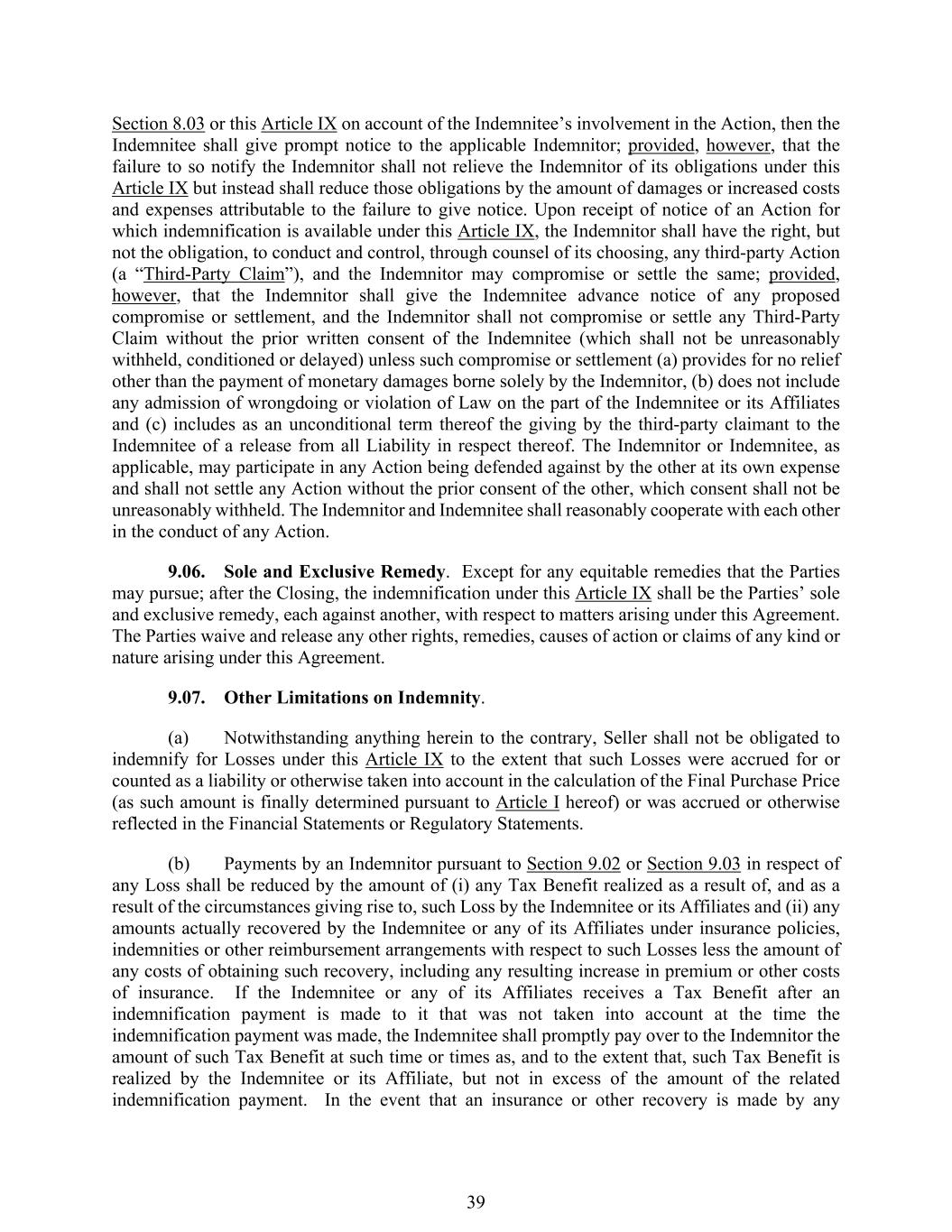 39 Section 8.03 or this Article IX on account of the Indemnitee’s involvement in the Action, then the Indemnitee shall give prompt notice to the applicable Indemnitor; provided, however, that the failure to so notify the Indemnitor shall not relieve the Indemnitor of its obligations under this Article IX but instead shall reduce those obligations by the amount of damages or increased costs and expenses attributable to the failure to give notice. Upon receipt of notice of an Action for which indemnification is available under this Article IX, the Indemnitor shall have the right, but not the obligation, to conduct and control, through counsel of its choosing, any third-party Action (a “Third-Party Claim”), and the Indemnitor may compromise or settle the same; provided, however, that the Indemnitor shall give the Indemnitee advance notice of any proposed compromise or settlement, and the Indemnitor shall not compromise or settle any Third-Party Claim without the prior written consent of the Indemnitee (which shall not be unreasonably withheld, conditioned or delayed) unless such compromise or settlement (a) provides for no relief other than the payment of monetary damages borne solely by the Indemnitor, (b) does not include any admission of wrongdoing or violation of Law on the part of the Indemnitee or its Affiliates and (c) includes as an unconditional term thereof the giving by the third-party claimant to the Indemnitee of a release from all Liability in respect thereof. The Indemnitor or Indemnitee, as applicable, may participate in any Action being defended against by the other at its own expense and shall not settle any Action without the prior consent of the other, which consent shall not be unreasonably withheld. The Indemnitor and Indemnitee shall reasonably cooperate with each other in the conduct of any Action. 9.06. Sole and Exclusive Remedy. Except for any equitable remedies that the Parties may pursue; after the Closing, the indemnification under this Article IX shall be the Parties’ sole and exclusive remedy, each against another, with respect to matters arising under this Agreement. The Parties waive and release any other rights, remedies, causes of action or claims of any kind or nature arising under this Agreement. 9.07. Other Limitations on Indemnity. (a) Notwithstanding anything herein to the contrary, Seller shall not be obligated to indemnify for Losses under this Article IX to the extent that such Losses were accrued for or counted as a liability or otherwise taken into account in the calculation of the Final Purchase Price (as such amount is finally determined pursuant to Article I hereof) or was accrued or otherwise reflected in the Financial Statements or Regulatory Statements. (b) Payments by an Indemnitor pursuant to Section 9.02 or Section 9.03 in respect of any Loss shall be reduced by the amount of (i) any Tax Benefit realized as a result of, and as a result of the circumstances giving rise to, such Loss by the Indemnitee or its Affiliates and (ii) any amounts actually recovered by the Indemnitee or any of its Affiliates under insurance policies, indemnities or other reimbursement arrangements with respect to such Losses less the amount of any costs of obtaining such recovery, including any resulting increase in premium or other costs of insurance. If the Indemnitee or any of its Affiliates receives a Tax Benefit after an indemnification payment is made to it that was not taken into account at the time the indemnification payment was made, the Indemnitee shall promptly pay over to the Indemnitor the amount of such Tax Benefit at such time or times as, and to the extent that, such Tax Benefit is realized by the Indemnitee or its Affiliate, but not in excess of the amount of the related indemnification payment. In the event that an insurance or other recovery is made by any
