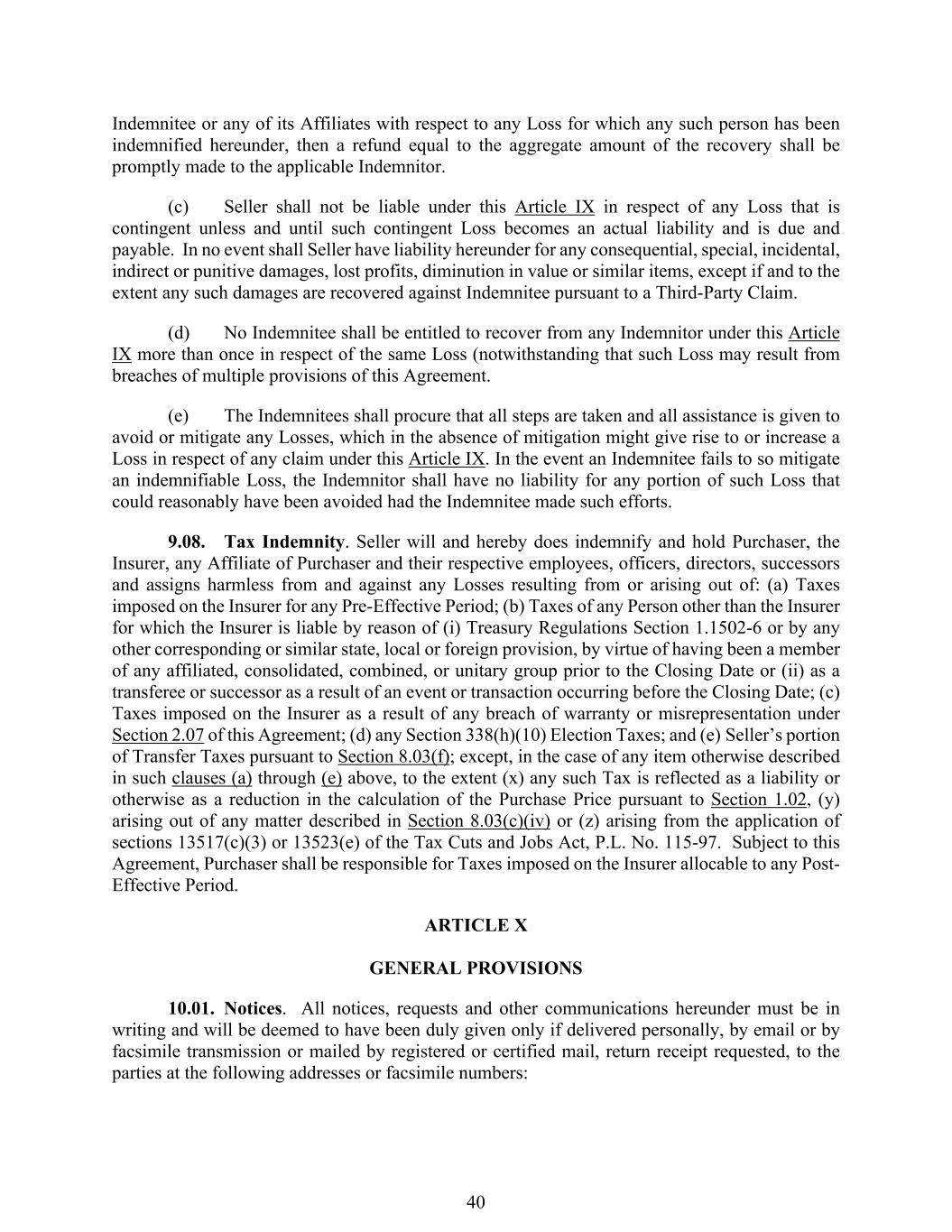 40 Indemnitee or any of its Affiliates with respect to any Loss for which any such person has been indemnified hereunder, then a refund equal to the aggregate amount of the recovery shall be promptly made to the applicable Indemnitor. (c) Seller shall not be liable under this Article IX in respect of any Loss that is contingent unless and until such contingent Loss becomes an actual liability and is due and payable. In no event shall Seller have liability hereunder for any consequential, special, incidental, indirect or punitive damages, lost profits, diminution in value or similar items, except if and to the extent any such damages are recovered against Indemnitee pursuant to a Third-Party Claim. (d) No Indemnitee shall be entitled to recover from any Indemnitor under this Article IX more than once in respect of the same Loss (notwithstanding that such Loss may result from breaches of multiple provisions of this Agreement. (e) The Indemnitees shall procure that all steps are taken and all assistance is given to avoid or mitigate any Losses, which in the absence of mitigation might give rise to or increase a Loss in respect of any claim under this Article IX. In the event an Indemnitee fails to so mitigate an indemnifiable Loss, the Indemnitor shall have no liability for any portion of such Loss that could reasonably have been avoided had the Indemnitee made such efforts. 9.08. Tax Indemnity. Seller will and hereby does indemnify and hold Purchaser, the Insurer, any Affiliate of Purchaser and their respective employees, officers, directors, successors and assigns harmless from and against any Losses resulting from or arising out of: (a) Taxes imposed on the Insurer for any Pre-Effective Period; (b) Taxes of any Person other than the Insurer for which the Insurer is liable by reason of (i) Treasury Regulations Section 1.1502-6 or by any other corresponding or similar state, local or foreign provision, by virtue of having been a member of any affiliated, consolidated, combined, or unitary group prior to the Closing Date or (ii) as a transferee or successor as a result of an event or transaction occurring before the Closing Date; (c) Taxes imposed on the Insurer as a result of any breach of warranty or misrepresentation under Section 2.07 of this Agreement; (d) any Section 338(h)(10) Election Taxes; and (e) Seller’s portion of Transfer Taxes pursuant to Section 8.03(f); except, in the case of any item otherwise described in such clauses (a) through (e) above, to the extent (x) any such Tax is reflected as a liability or otherwise as a reduction in the calculation of the Purchase Price pursuant to Section 1.02, (y) arising out of any matter described in Section 8.03(c)(iv) or (z) arising from the application of sections 13517(c)(3) or 13523(e) of the Tax Cuts and Jobs Act, P.L. No. 115-97. Subject to this Agreement, Purchaser shall be responsible for Taxes imposed on the Insurer allocable to any Post- Effective Period. ARTICLE X GENERAL PROVISIONS 10.01. Notices. All notices, requests and other communications hereunder must be in writing and will be deemed to have been duly given only if delivered personally, by email or by facsimile transmission or mailed by registered or certified mail, return receipt requested, to the parties at the following addresses or facsimile numbers: