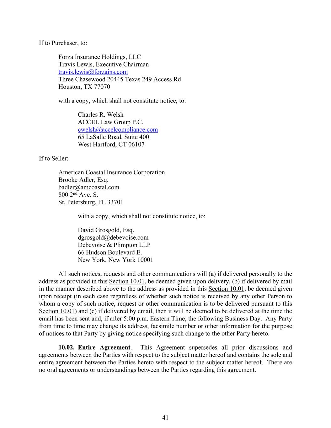 41 If to Purchaser, to: Forza Insurance Holdings, LLC Travis Lewis, Executive Chairman travis.lewis@forzains.com Three Chasewood 20445 Texas 249 Access Rd Houston, TX 77070 with a copy, which shall not constitute notice, to: Charles R. Welsh ACCEL Law Group P.C. cwelsh@accelcompliance.com 65 LaSalle Road, Suite 400 West Hartford, CT 06107 If to Seller: American Coastal Insurance Corporation Brooke Adler, Esq. badler@amcoastal.com 800 2nd Ave. S. St. Petersburg, FL 33701 with a copy, which shall not constitute notice, to: David Grosgold, Esq. dgrosgold@debevoise.com Debevoise & Plimpton LLP 66 Hudson Boulevard E. New York, New York 10001 All such notices, requests and other communications will (a) if delivered personally to the address as provided in this Section 10.01, be deemed given upon delivery, (b) if delivered by mail in the manner described above to the address as provided in this Section 10.01, be deemed given upon receipt (in each case regardless of whether such notice is received by any other Person to whom a copy of such notice, request or other communication is to be delivered pursuant to this Section 10.01) and (c) if delivered by email, then it will be deemed to be delivered at the time the email has been sent and, if after 5:00 p.m. Eastern Time, the following Business Day. Any Party from time to time may change its address, facsimile number or other information for the purpose of notices to that Party by giving notice specifying such change to the other Party hereto. 10.02. Entire Agreement. This Agreement supersedes all prior discussions and agreements between the Parties with respect to the subject matter hereof and contains the sole and entire agreement between the Parties hereto with respect to the subject matter hereof. There are no oral agreements or understandings between the Parties regarding this agreement.