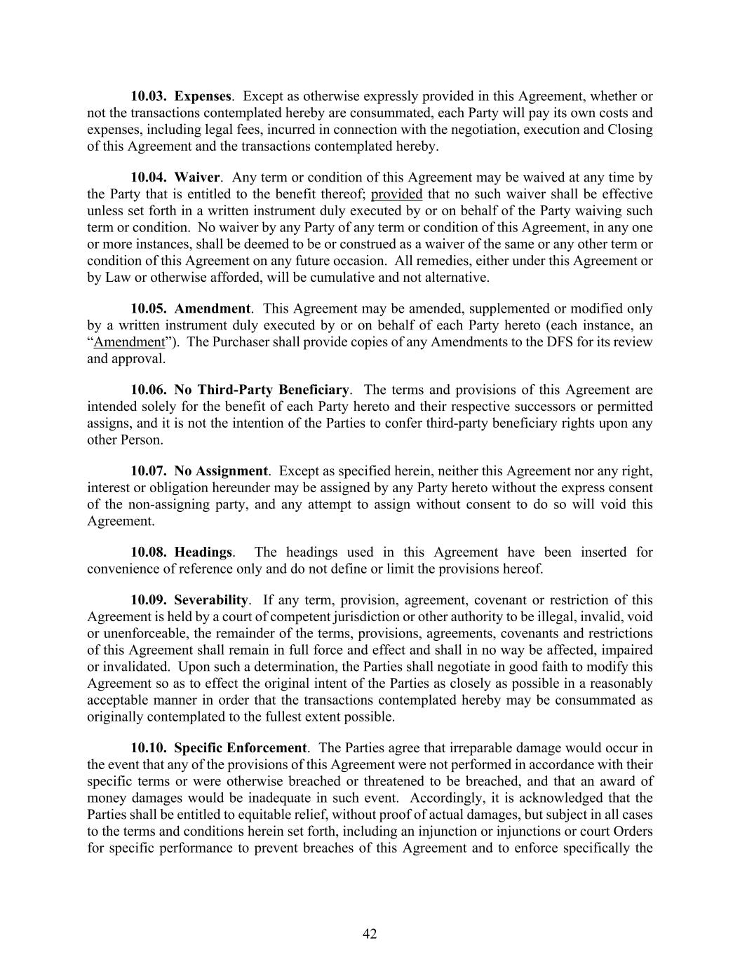 42 10.03. Expenses. Except as otherwise expressly provided in this Agreement, whether or not the transactions contemplated hereby are consummated, each Party will pay its own costs and expenses, including legal fees, incurred in connection with the negotiation, execution and Closing of this Agreement and the transactions contemplated hereby. 10.04. Waiver. Any term or condition of this Agreement may be waived at any time by the Party that is entitled to the benefit thereof; provided that no such waiver shall be effective unless set forth in a written instrument duly executed by or on behalf of the Party waiving such term or condition. No waiver by any Party of any term or condition of this Agreement, in any one or more instances, shall be deemed to be or construed as a waiver of the same or any other term or condition of this Agreement on any future occasion. All remedies, either under this Agreement or by Law or otherwise afforded, will be cumulative and not alternative. 10.05. Amendment. This Agreement may be amended, supplemented or modified only by a written instrument duly executed by or on behalf of each Party hereto (each instance, an “Amendment”). The Purchaser shall provide copies of any Amendments to the DFS for its review and approval. 10.06. No Third-Party Beneficiary. The terms and provisions of this Agreement are intended solely for the benefit of each Party hereto and their respective successors or permitted assigns, and it is not the intention of the Parties to confer third-party beneficiary rights upon any other Person. 10.07. No Assignment. Except as specified herein, neither this Agreement nor any right, interest or obligation hereunder may be assigned by any Party hereto without the express consent of the non-assigning party, and any attempt to assign without consent to do so will void this Agreement. 10.08. Headings. The headings used in this Agreement have been inserted for convenience of reference only and do not define or limit the provisions hereof. 10.09. Severability. If any term, provision, agreement, covenant or restriction of this Agreement is held by a court of competent jurisdiction or other authority to be illegal, invalid, void or unenforceable, the remainder of the terms, provisions, agreements, covenants and restrictions of this Agreement shall remain in full force and effect and shall in no way be affected, impaired or invalidated. Upon such a determination, the Parties shall negotiate in good faith to modify this Agreement so as to effect the original intent of the Parties as closely as possible in a reasonably acceptable manner in order that the transactions contemplated hereby may be consummated as originally contemplated to the fullest extent possible. 10.10. Specific Enforcement. The Parties agree that irreparable damage would occur in the event that any of the provisions of this Agreement were not performed in accordance with their specific terms or were otherwise breached or threatened to be breached, and that an award of money damages would be inadequate in such event. Accordingly, it is acknowledged that the Parties shall be entitled to equitable relief, without proof of actual damages, but subject in all cases to the terms and conditions herein set forth, including an injunction or injunctions or court Orders for specific performance to prevent breaches of this Agreement and to enforce specifically the