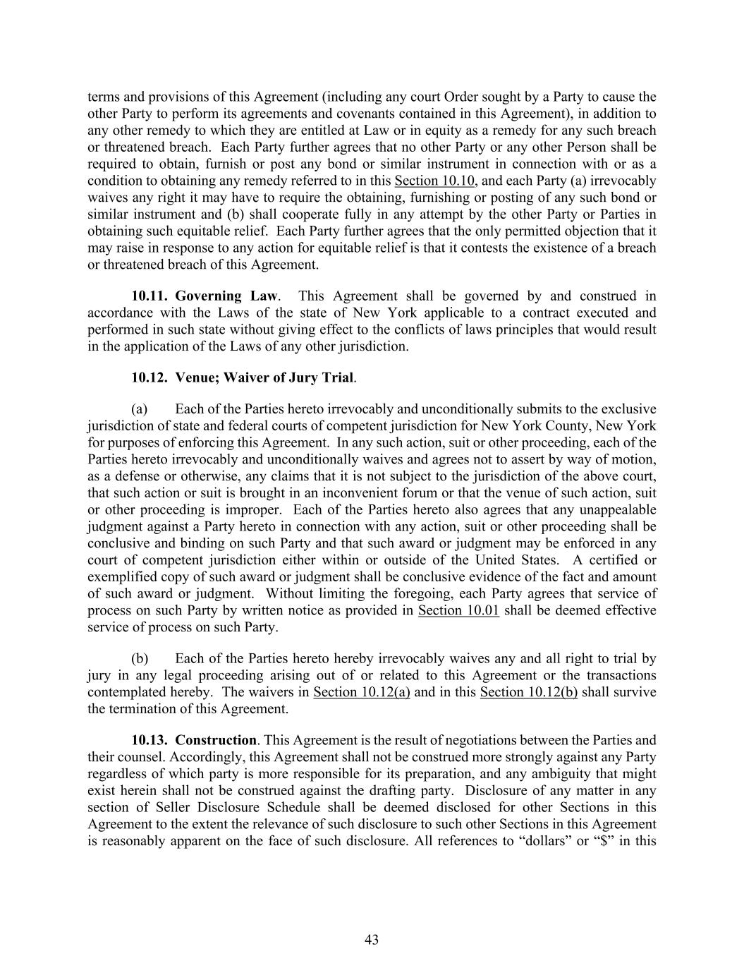 43 terms and provisions of this Agreement (including any court Order sought by a Party to cause the other Party to perform its agreements and covenants contained in this Agreement), in addition to any other remedy to which they are entitled at Law or in equity as a remedy for any such breach or threatened breach. Each Party further agrees that no other Party or any other Person shall be required to obtain, furnish or post any bond or similar instrument in connection with or as a condition to obtaining any remedy referred to in this Section 10.10, and each Party (a) irrevocably waives any right it may have to require the obtaining, furnishing or posting of any such bond or similar instrument and (b) shall cooperate fully in any attempt by the other Party or Parties in obtaining such equitable relief. Each Party further agrees that the only permitted objection that it may raise in response to any action for equitable relief is that it contests the existence of a breach or threatened breach of this Agreement. 10.11. Governing Law. This Agreement shall be governed by and construed in accordance with the Laws of the state of New York applicable to a contract executed and performed in such state without giving effect to the conflicts of laws principles that would result in the application of the Laws of any other jurisdiction. 10.12. Venue; Waiver of Jury Trial. (a) Each of the Parties hereto irrevocably and unconditionally submits to the exclusive jurisdiction of state and federal courts of competent jurisdiction for New York County, New York for purposes of enforcing this Agreement. In any such action, suit or other proceeding, each of the Parties hereto irrevocably and unconditionally waives and agrees not to assert by way of motion, as a defense or otherwise, any claims that it is not subject to the jurisdiction of the above court, that such action or suit is brought in an inconvenient forum or that the venue of such action, suit or other proceeding is improper. Each of the Parties hereto also agrees that any unappealable judgment against a Party hereto in connection with any action, suit or other proceeding shall be conclusive and binding on such Party and that such award or judgment may be enforced in any court of competent jurisdiction either within or outside of the United States. A certified or exemplified copy of such award or judgment shall be conclusive evidence of the fact and amount of such award or judgment. Without limiting the foregoing, each Party agrees that service of process on such Party by written notice as provided in Section 10.01 shall be deemed effective service of process on such Party. (b) Each of the Parties hereto hereby irrevocably waives any and all right to trial by jury in any legal proceeding arising out of or related to this Agreement or the transactions contemplated hereby. The waivers in Section 10.12(a) and in this Section 10.12(b) shall survive the termination of this Agreement. 10.13. Construction. This Agreement is the result of negotiations between the Parties and their counsel. Accordingly, this Agreement shall not be construed more strongly against any Party regardless of which party is more responsible for its preparation, and any ambiguity that might exist herein shall not be construed against the drafting party. Disclosure of any matter in any section of Seller Disclosure Schedule shall be deemed disclosed for other Sections in this Agreement to the extent the relevance of such disclosure to such other Sections in this Agreement is reasonably apparent on the face of such disclosure. All references to “dollars” or “$” in this