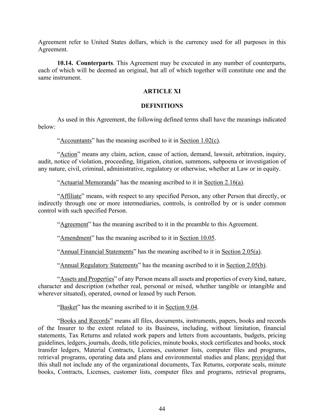 44 Agreement refer to United States dollars, which is the currency used for all purposes in this Agreement. 10.14. Counterparts. This Agreement may be executed in any number of counterparts, each of which will be deemed an original, but all of which together will constitute one and the same instrument. ARTICLE XI DEFINITIONS As used in this Agreement, the following defined terms shall have the meanings indicated below: “Accountants” has the meaning ascribed to it in Section 1.02(c). “Action” means any claim, action, cause of action, demand, lawsuit, arbitration, inquiry, audit, notice of violation, proceeding, litigation, citation, summons, subpoena or investigation of any nature, civil, criminal, administrative, regulatory or otherwise, whether at Law or in equity. “Actuarial Memoranda” has the meaning ascribed to it in Section 2.16(a). “Affiliate” means, with respect to any specified Person, any other Person that directly, or indirectly through one or more intermediaries, controls, is controlled by or is under common control with such specified Person. “Agreement” has the meaning ascribed to it in the preamble to this Agreement. “Amendment” has the meaning ascribed to it in Section 10.05. “Annual Financial Statements” has the meaning ascribed to it in Section 2.05(a). “Annual Regulatory Statements” has the meaning ascribed to it in Section 2.05(b). “Assets and Properties” of any Person means all assets and properties of every kind, nature, character and description (whether real, personal or mixed, whether tangible or intangible and wherever situated), operated, owned or leased by such Person. “Basket” has the meaning ascribed to it in Section 9.04. “Books and Records” means all files, documents, instruments, papers, books and records of the Insurer to the extent related to its Business, including, without limitation, financial statements, Tax Returns and related work papers and letters from accountants, budgets, pricing guidelines, ledgers, journals, deeds, title policies, minute books, stock certificates and books, stock transfer ledgers, Material Contracts, Licenses, customer lists, computer files and programs, retrieval programs, operating data and plans and environmental studies and plans; provided that this shall not include any of the organizational documents, Tax Returns, corporate seals, minute books, Contracts, Licenses, customer lists, computer files and programs, retrieval programs,