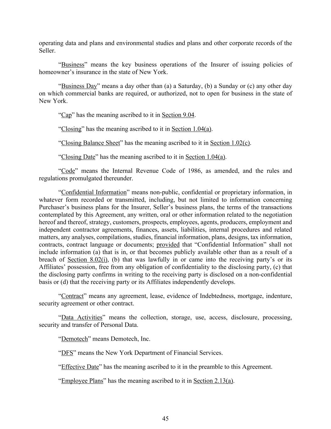 45 operating data and plans and environmental studies and plans and other corporate records of the Seller. “Business” means the key business operations of the Insurer of issuing policies of homeowner’s insurance in the state of New York. “Business Day” means a day other than (a) a Saturday, (b) a Sunday or (c) any other day on which commercial banks are required, or authorized, not to open for business in the state of New York. “Cap” has the meaning ascribed to it in Section 9.04. “Closing” has the meaning ascribed to it in Section 1.04(a). “Closing Balance Sheet” has the meaning ascribed to it in Section 1.02(c). “Closing Date” has the meaning ascribed to it in Section 1.04(a). “Code” means the Internal Revenue Code of 1986, as amended, and the rules and regulations promulgated thereunder. “Confidential Information” means non-public, confidential or proprietary information, in whatever form recorded or transmitted, including, but not limited to information concerning Purchaser’s business plans for the Insurer, Seller’s business plans, the terms of the transactions contemplated by this Agreement, any written, oral or other information related to the negotiation hereof and thereof, strategy, customers, prospects, employees, agents, producers, employment and independent contractor agreements, finances, assets, liabilities, internal procedures and related matters, any analyses, compilations, studies, financial information, plans, designs, tax information, contracts, contract language or documents; provided that “Confidential Information” shall not include information (a) that is in, or that becomes publicly available other than as a result of a breach of Section 8.02(i), (b) that was lawfully in or came into the receiving party’s or its Affiliates’ possession, free from any obligation of confidentiality to the disclosing party, (c) that the disclosing party confirms in writing to the receiving party is disclosed on a non-confidential basis or (d) that the receiving party or its Affiliates independently develops. “Contract” means any agreement, lease, evidence of Indebtedness, mortgage, indenture, security agreement or other contract. “Data Activities” means the collection, storage, use, access, disclosure, processing, security and transfer of Personal Data. “Demotech” means Demotech, Inc. “DFS” means the New York Department of Financial Services. “Effective Date” has the meaning ascribed to it in the preamble to this Agreement. “Employee Plans” has the meaning ascribed to it in Section 2.13(a).