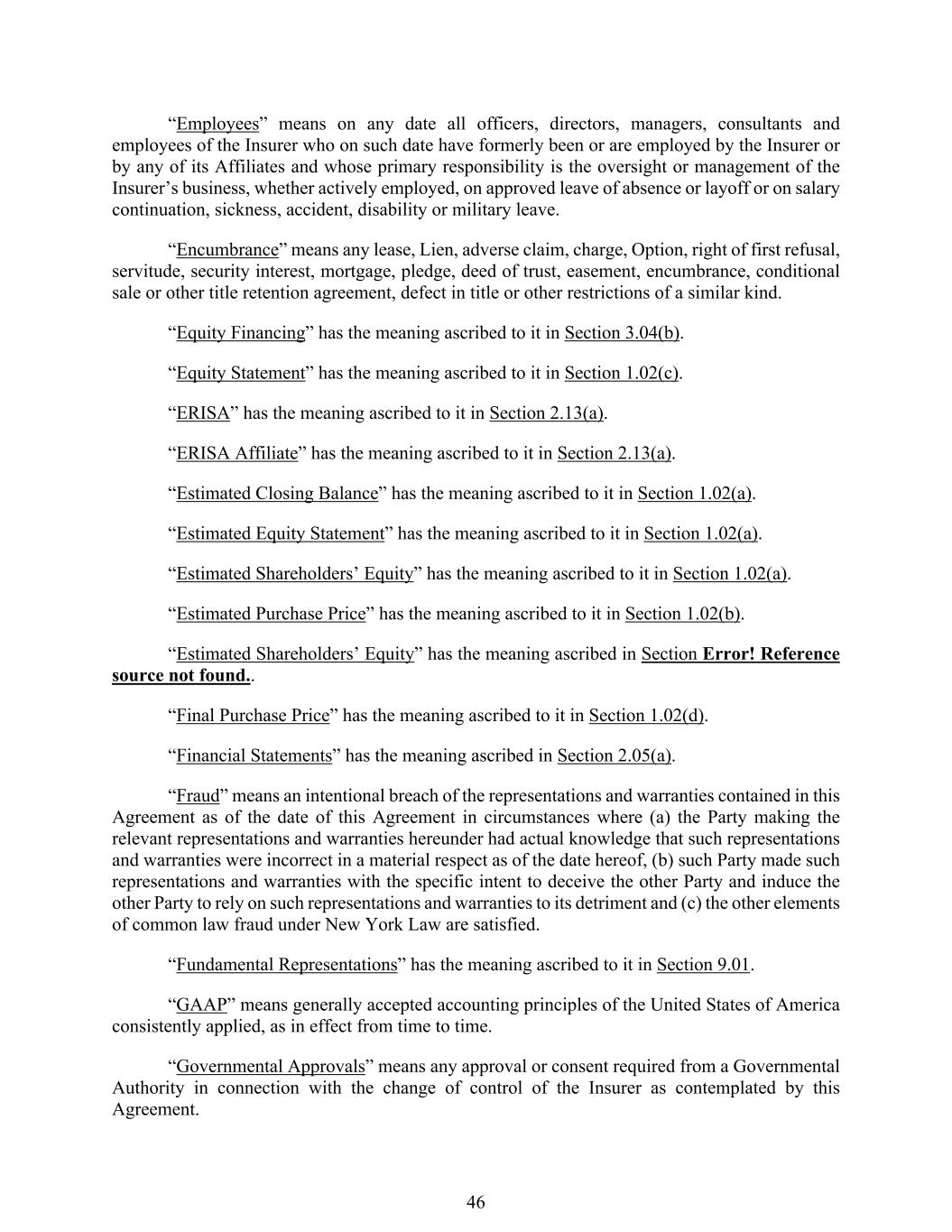 46 “Employees” means on any date all officers, directors, managers, consultants and employees of the Insurer who on such date have formerly been or are employed by the Insurer or by any of its Affiliates and whose primary responsibility is the oversight or management of the Insurer’s business, whether actively employed, on approved leave of absence or layoff or on salary continuation, sickness, accident, disability or military leave. “Encumbrance” means any lease, Lien, adverse claim, charge, Option, right of first refusal, servitude, security interest, mortgage, pledge, deed of trust, easement, encumbrance, conditional sale or other title retention agreement, defect in title or other restrictions of a similar kind. “Equity Financing” has the meaning ascribed to it in Section 3.04(b). “Equity Statement” has the meaning ascribed to it in Section 1.02(c). “ERISA” has the meaning ascribed to it in Section 2.13(a). “ERISA Affiliate” has the meaning ascribed to it in Section 2.13(a). “Estimated Closing Balance” has the meaning ascribed to it in Section 1.02(a). “Estimated Equity Statement” has the meaning ascribed to it in Section 1.02(a). “Estimated Shareholders’ Equity” has the meaning ascribed to it in Section 1.02(a). “Estimated Purchase Price” has the meaning ascribed to it in Section 1.02(b). “Estimated Shareholders’ Equity” has the meaning ascribed in Section Error! Reference source not found.. “Final Purchase Price” has the meaning ascribed to it in Section 1.02(d). “Financial Statements” has the meaning ascribed in Section 2.05(a). “Fraud” means an intentional breach of the representations and warranties contained in this Agreement as of the date of this Agreement in circumstances where (a) the Party making the relevant representations and warranties hereunder had actual knowledge that such representations and warranties were incorrect in a material respect as of the date hereof, (b) such Party made such representations and warranties with the specific intent to deceive the other Party and induce the other Party to rely on such representations and warranties to its detriment and (c) the other elements of common law fraud under New York Law are satisfied. “Fundamental Representations” has the meaning ascribed to it in Section 9.01. “GAAP” means generally accepted accounting principles of the United States of America consistently applied, as in effect from time to time. “Governmental Approvals” means any approval or consent required from a Governmental Authority in connection with the change of control of the Insurer as contemplated by this Agreement.
