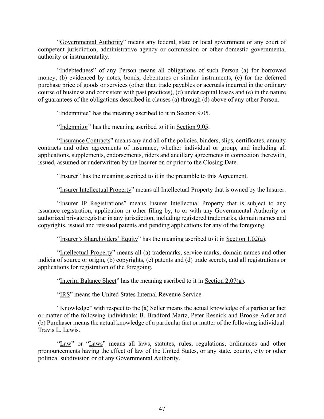 47 “Governmental Authority” means any federal, state or local government or any court of competent jurisdiction, administrative agency or commission or other domestic governmental authority or instrumentality. “Indebtedness” of any Person means all obligations of such Person (a) for borrowed money, (b) evidenced by notes, bonds, debentures or similar instruments, (c) for the deferred purchase price of goods or services (other than trade payables or accruals incurred in the ordinary course of business and consistent with past practices), (d) under capital leases and (e) in the nature of guarantees of the obligations described in clauses (a) through (d) above of any other Person. “Indemnitee” has the meaning ascribed to it in Section 9.05. “Indemnitor” has the meaning ascribed to it in Section 9.05. “Insurance Contracts” means any and all of the policies, binders, slips, certificates, annuity contracts and other agreements of insurance, whether individual or group, and including all applications, supplements, endorsements, riders and ancillary agreements in connection therewith, issued, assumed or underwritten by the Insurer on or prior to the Closing Date. “Insurer” has the meaning ascribed to it in the preamble to this Agreement. “Insurer Intellectual Property” means all Intellectual Property that is owned by the Insurer. “Insurer IP Registrations” means Insurer Intellectual Property that is subject to any issuance registration, application or other filing by, to or with any Governmental Authority or authorized private registrar in any jurisdiction, including registered trademarks, domain names and copyrights, issued and reissued patents and pending applications for any of the foregoing. “Insurer’s Shareholders’ Equity” has the meaning ascribed to it in Section 1.02(a). “Intellectual Property” means all (a) trademarks, service marks, domain names and other indicia of source or origin, (b) copyrights, (c) patents and (d) trade secrets, and all registrations or applications for registration of the foregoing. “Interim Balance Sheet” has the meaning ascribed to it in Section 2.07(g). “IRS” means the United States Internal Revenue Service. “Knowledge” with respect to the (a) Seller means the actual knowledge of a particular fact or matter of the following individuals: B. Bradford Martz, Peter Resnick and Brooke Adler and (b) Purchaser means the actual knowledge of a particular fact or matter of the following individual: Travis L. Lewis. “Law” or “Laws” means all laws, statutes, rules, regulations, ordinances and other pronouncements having the effect of law of the United States, or any state, county, city or other political subdivision or of any Governmental Authority.