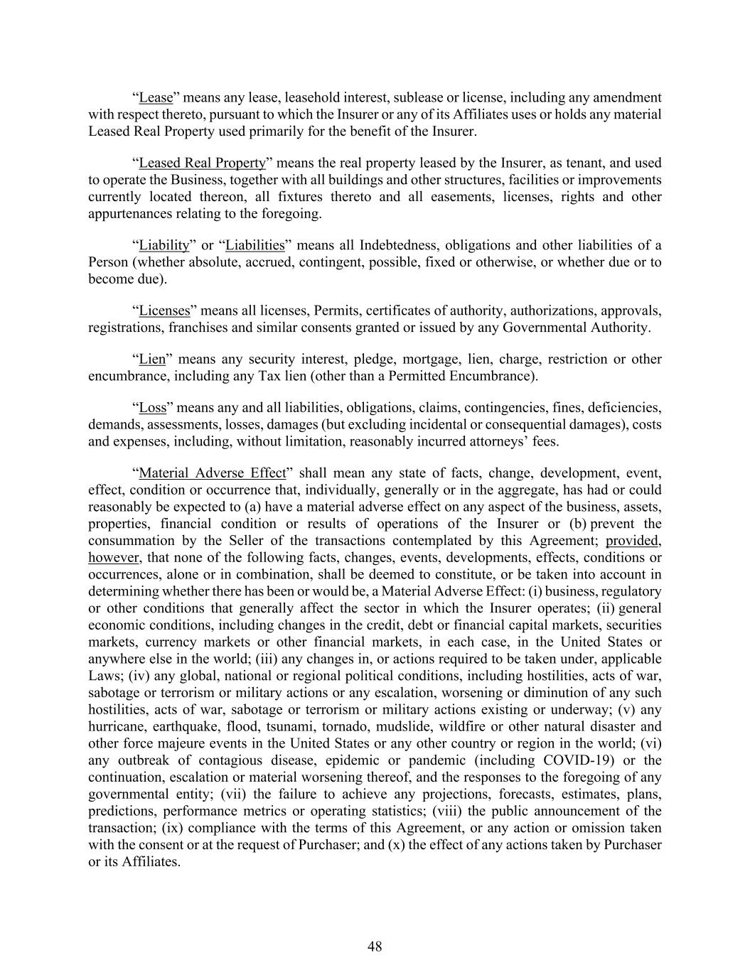 48 “Lease” means any lease, leasehold interest, sublease or license, including any amendment with respect thereto, pursuant to which the Insurer or any of its Affiliates uses or holds any material Leased Real Property used primarily for the benefit of the Insurer. “Leased Real Property” means the real property leased by the Insurer, as tenant, and used to operate the Business, together with all buildings and other structures, facilities or improvements currently located thereon, all fixtures thereto and all easements, licenses, rights and other appurtenances relating to the foregoing. “Liability” or “Liabilities” means all Indebtedness, obligations and other liabilities of a Person (whether absolute, accrued, contingent, possible, fixed or otherwise, or whether due or to become due). “Licenses” means all licenses, Permits, certificates of authority, authorizations, approvals, registrations, franchises and similar consents granted or issued by any Governmental Authority. “Lien” means any security interest, pledge, mortgage, lien, charge, restriction or other encumbrance, including any Tax lien (other than a Permitted Encumbrance). “Loss” means any and all liabilities, obligations, claims, contingencies, fines, deficiencies, demands, assessments, losses, damages (but excluding incidental or consequential damages), costs and expenses, including, without limitation, reasonably incurred attorneys’ fees. “Material Adverse Effect” shall mean any state of facts, change, development, event, effect, condition or occurrence that, individually, generally or in the aggregate, has had or could reasonably be expected to (a) have a material adverse effect on any aspect of the business, assets, properties, financial condition or results of operations of the Insurer or (b) prevent the consummation by the Seller of the transactions contemplated by this Agreement; provided, however, that none of the following facts, changes, events, developments, effects, conditions or occurrences, alone or in combination, shall be deemed to constitute, or be taken into account in determining whether there has been or would be, a Material Adverse Effect: (i) business, regulatory or other conditions that generally affect the sector in which the Insurer operates; (ii) general economic conditions, including changes in the credit, debt or financial capital markets, securities markets, currency markets or other financial markets, in each case, in the United States or anywhere else in the world; (iii) any changes in, or actions required to be taken under, applicable Laws; (iv) any global, national or regional political conditions, including hostilities, acts of war, sabotage or terrorism or military actions or any escalation, worsening or diminution of any such hostilities, acts of war, sabotage or terrorism or military actions existing or underway; (v) any hurricane, earthquake, flood, tsunami, tornado, mudslide, wildfire or other natural disaster and other force majeure events in the United States or any other country or region in the world; (vi) any outbreak of contagious disease, epidemic or pandemic (including COVID-19) or the continuation, escalation or material worsening thereof, and the responses to the foregoing of any governmental entity; (vii) the failure to achieve any projections, forecasts, estimates, plans, predictions, performance metrics or operating statistics; (viii) the public announcement of the transaction; (ix) compliance with the terms of this Agreement, or any action or omission taken with the consent or at the request of Purchaser; and (x) the effect of any actions taken by Purchaser or its Affiliates.