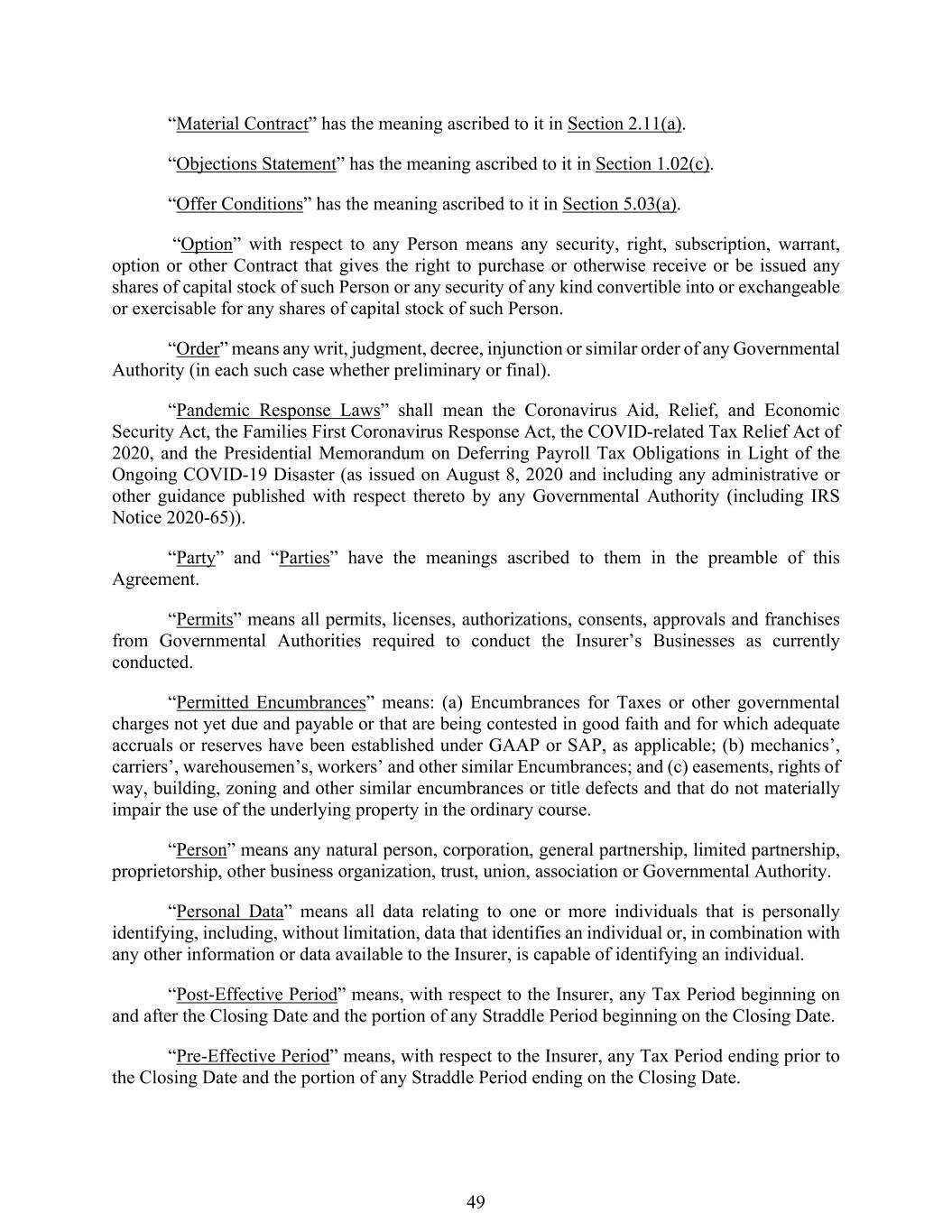 49 “Material Contract” has the meaning ascribed to it in Section 2.11(a). “Objections Statement” has the meaning ascribed to it in Section 1.02(c). “Offer Conditions” has the meaning ascribed to it in Section 5.03(a). “Option” with respect to any Person means any security, right, subscription, warrant, option or other Contract that gives the right to purchase or otherwise receive or be issued any shares of capital stock of such Person or any security of any kind convertible into or exchangeable or exercisable for any shares of capital stock of such Person. “Order” means any writ, judgment, decree, injunction or similar order of any Governmental Authority (in each such case whether preliminary or final). “Pandemic Response Laws” shall mean the Coronavirus Aid, Relief, and Economic Security Act, the Families First Coronavirus Response Act, the COVID-related Tax Relief Act of 2020, and the Presidential Memorandum on Deferring Payroll Tax Obligations in Light of the Ongoing COVID-19 Disaster (as issued on August 8, 2020 and including any administrative or other guidance published with respect thereto by any Governmental Authority (including IRS Notice 2020-65)). “Party” and “Parties” have the meanings ascribed to them in the preamble of this Agreement. “Permits” means all permits, licenses, authorizations, consents, approvals and franchises from Governmental Authorities required to conduct the Insurer’s Businesses as currently conducted. “Permitted Encumbrances” means: (a) Encumbrances for Taxes or other governmental charges not yet due and payable or that are being contested in good faith and for which adequate accruals or reserves have been established under GAAP or SAP, as applicable; (b) mechanics’, carriers’, warehousemen’s, workers’ and other similar Encumbrances; and (c) easements, rights of way, building, zoning and other similar encumbrances or title defects and that do not materially impair the use of the underlying property in the ordinary course. “Person” means any natural person, corporation, general partnership, limited partnership, proprietorship, other business organization, trust, union, association or Governmental Authority. “Personal Data” means all data relating to one or more individuals that is personally identifying, including, without limitation, data that identifies an individual or, in combination with any other information or data available to the Insurer, is capable of identifying an individual. “Post-Effective Period” means, with respect to the Insurer, any Tax Period beginning on and after the Closing Date and the portion of any Straddle Period beginning on the Closing Date. “Pre-Effective Period” means, with respect to the Insurer, any Tax Period ending prior to the Closing Date and the portion of any Straddle Period ending on the Closing Date.