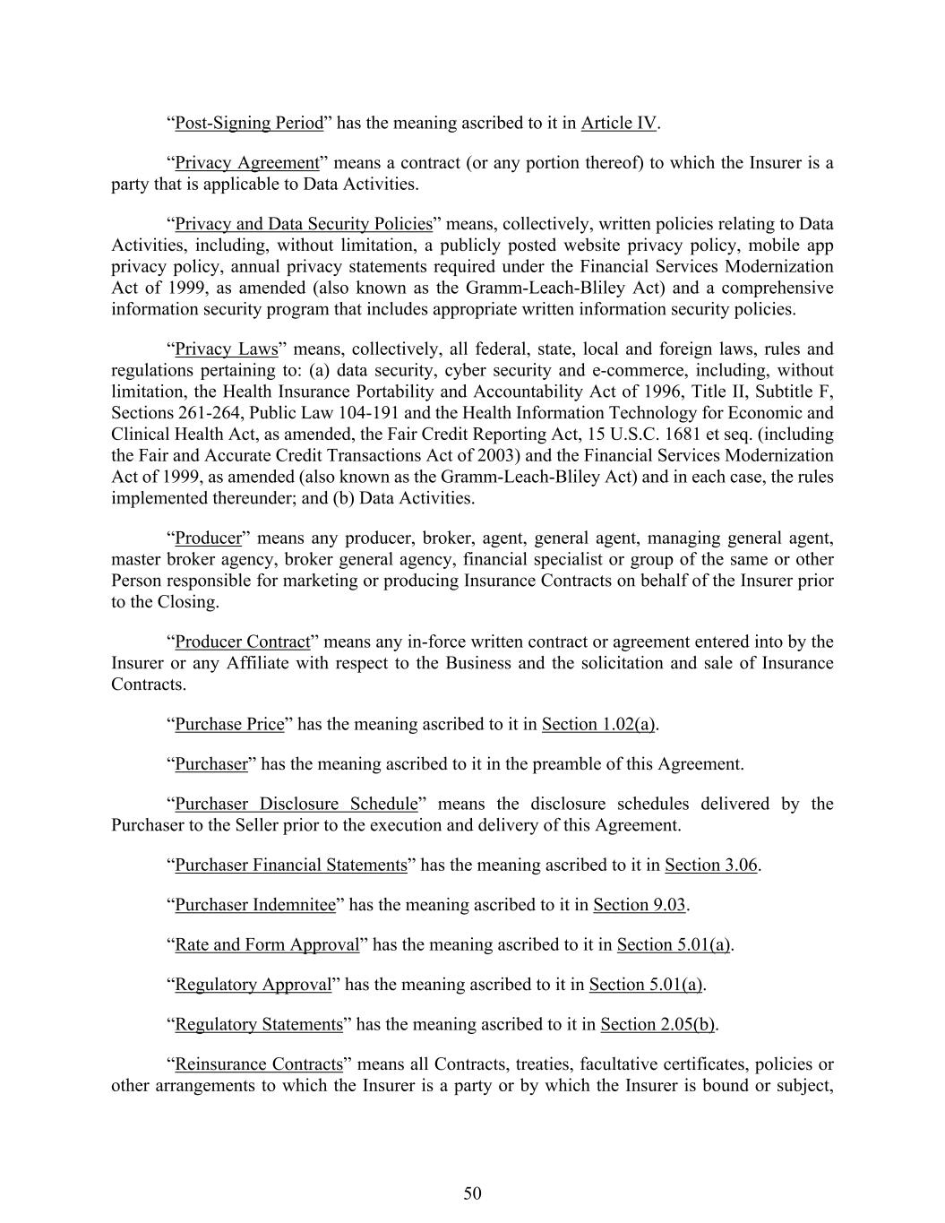 50 “Post-Signing Period” has the meaning ascribed to it in Article IV. “Privacy Agreement” means a contract (or any portion thereof) to which the Insurer is a party that is applicable to Data Activities. “Privacy and Data Security Policies” means, collectively, written policies relating to Data Activities, including, without limitation, a publicly posted website privacy policy, mobile app privacy policy, annual privacy statements required under the Financial Services Modernization Act of 1999, as amended (also known as the Gramm-Leach-Bliley Act) and a comprehensive information security program that includes appropriate written information security policies. “Privacy Laws” means, collectively, all federal, state, local and foreign laws, rules and regulations pertaining to: (a) data security, cyber security and e-commerce, including, without limitation, the Health Insurance Portability and Accountability Act of 1996, Title II, Subtitle F, Sections 261-264, Public Law 104-191 and the Health Information Technology for Economic and Clinical Health Act, as amended, the Fair Credit Reporting Act, 15 U.S.C. 1681 et seq. (including the Fair and Accurate Credit Transactions Act of 2003) and the Financial Services Modernization Act of 1999, as amended (also known as the Gramm-Leach-Bliley Act) and in each case, the rules implemented thereunder; and (b) Data Activities. “Producer” means any producer, broker, agent, general agent, managing general agent, master broker agency, broker general agency, financial specialist or group of the same or other Person responsible for marketing or producing Insurance Contracts on behalf of the Insurer prior to the Closing. “Producer Contract” means any in-force written contract or agreement entered into by the Insurer or any Affiliate with respect to the Business and the solicitation and sale of Insurance Contracts. “Purchase Price” has the meaning ascribed to it in Section 1.02(a). “Purchaser” has the meaning ascribed to it in the preamble of this Agreement. “Purchaser Disclosure Schedule” means the disclosure schedules delivered by the Purchaser to the Seller prior to the execution and delivery of this Agreement. “Purchaser Financial Statements” has the meaning ascribed to it in Section 3.06. “Purchaser Indemnitee” has the meaning ascribed to it in Section 9.03. “Rate and Form Approval” has the meaning ascribed to it in Section 5.01(a). “Regulatory Approval” has the meaning ascribed to it in Section 5.01(a). “Regulatory Statements” has the meaning ascribed to it in Section 2.05(b). “Reinsurance Contracts” means all Contracts, treaties, facultative certificates, policies or other arrangements to which the Insurer is a party or by which the Insurer is bound or subject,