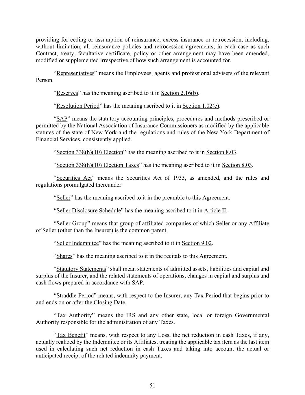 51 providing for ceding or assumption of reinsurance, excess insurance or retrocession, including, without limitation, all reinsurance policies and retrocession agreements, in each case as such Contract, treaty, facultative certificate, policy or other arrangement may have been amended, modified or supplemented irrespective of how such arrangement is accounted for. “Representatives” means the Employees, agents and professional advisers of the relevant Person. “Reserves” has the meaning ascribed to it in Section 2.16(b). “Resolution Period” has the meaning ascribed to it in Section 1.02(c). “SAP” means the statutory accounting principles, procedures and methods prescribed or permitted by the National Association of Insurance Commissioners as modified by the applicable statutes of the state of New York and the regulations and rules of the New York Department of Financial Services, consistently applied. “Section 338(h)(10) Election” has the meaning ascribed to it in Section 8.03. “Section 338(h)(10) Election Taxes” has the meaning ascribed to it in Section 8.03. “Securities Act” means the Securities Act of 1933, as amended, and the rules and regulations promulgated thereunder. “Seller” has the meaning ascribed to it in the preamble to this Agreement. “Seller Disclosure Schedule” has the meaning ascribed to it in Article II. “Seller Group” means that group of affiliated companies of which Seller or any Affiliate of Seller (other than the Insurer) is the common parent. “Seller Indemnitee” has the meaning ascribed to it in Section 9.02. “Shares” has the meaning ascribed to it in the recitals to this Agreement. “Statutory Statements” shall mean statements of admitted assets, liabilities and capital and surplus of the Insurer, and the related statements of operations, changes in capital and surplus and cash flows prepared in accordance with SAP. “Straddle Period” means, with respect to the Insurer, any Tax Period that begins prior to and ends on or after the Closing Date. “Tax Authority” means the IRS and any other state, local or foreign Governmental Authority responsible for the administration of any Taxes. “Tax Benefit” means, with respect to any Loss, the net reduction in cash Taxes, if any, actually realized by the Indemnitee or its Affiliates, treating the applicable tax item as the last item used in calculating such net reduction in cash Taxes and taking into account the actual or anticipated receipt of the related indemnity payment.