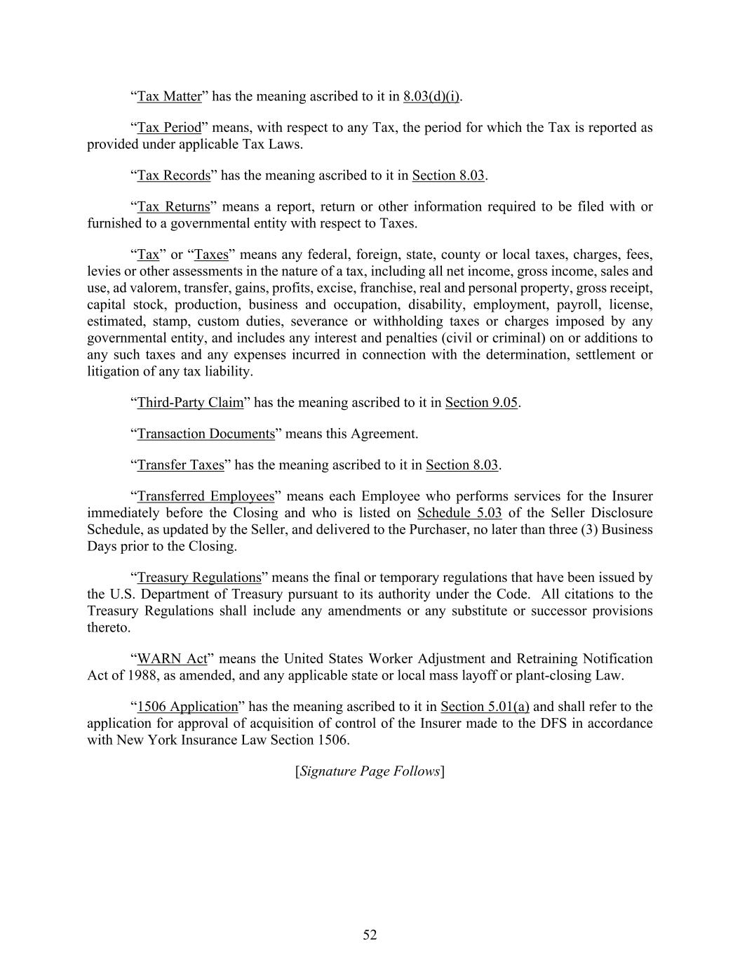 52 “Tax Matter” has the meaning ascribed to it in 8.03(d)(i). “Tax Period” means, with respect to any Tax, the period for which the Tax is reported as provided under applicable Tax Laws. “Tax Records” has the meaning ascribed to it in Section 8.03. “Tax Returns” means a report, return or other information required to be filed with or furnished to a governmental entity with respect to Taxes. “Tax” or “Taxes” means any federal, foreign, state, county or local taxes, charges, fees, levies or other assessments in the nature of a tax, including all net income, gross income, sales and use, ad valorem, transfer, gains, profits, excise, franchise, real and personal property, gross receipt, capital stock, production, business and occupation, disability, employment, payroll, license, estimated, stamp, custom duties, severance or withholding taxes or charges imposed by any governmental entity, and includes any interest and penalties (civil or criminal) on or additions to any such taxes and any expenses incurred in connection with the determination, settlement or litigation of any tax liability. “Third-Party Claim” has the meaning ascribed to it in Section 9.05. “Transaction Documents” means this Agreement. “Transfer Taxes” has the meaning ascribed to it in Section 8.03. “Transferred Employees” means each Employee who performs services for the Insurer immediately before the Closing and who is listed on Schedule 5.03 of the Seller Disclosure Schedule, as updated by the Seller, and delivered to the Purchaser, no later than three (3) Business Days prior to the Closing. “Treasury Regulations” means the final or temporary regulations that have been issued by the U.S. Department of Treasury pursuant to its authority under the Code. All citations to the Treasury Regulations shall include any amendments or any substitute or successor provisions thereto. “WARN Act” means the United States Worker Adjustment and Retraining Notification Act of 1988, as amended, and any applicable state or local mass layoff or plant-closing Law. “1506 Application” has the meaning ascribed to it in Section 5.01(a) and shall refer to the application for approval of acquisition of control of the Insurer made to the DFS in accordance with New York Insurance Law Section 1506. [Signature Page Follows]
