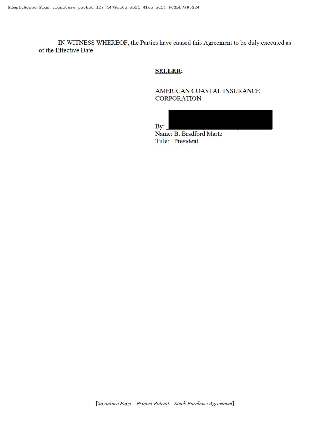 Execution Version ______________________________________________ STOCK PURCHASE AGREEMENT BETWEEN FORZA INSURANCE HOLDINGS, LLC and AMERICAN COASTAL INSURANCE CORPORATION May 9, 2024 ___________________________ THIS DOCUMENT IS INTENDED SOLELY TO FACILITATE DISCUSSIONS AMONG THE PARTIES. THIS DOCUMENT IS NOT INTENDED TO CREATE NOR WILL IT BE DEEMED TO CREATE A LEGALLY BINDING OR ENFORCEABLE OFFER OR AGREEMENT OF ANY TYPE OR NATURE, UNLESS AND UNTIL AGREED TO AND EXECUTED BY THE PARTIES.