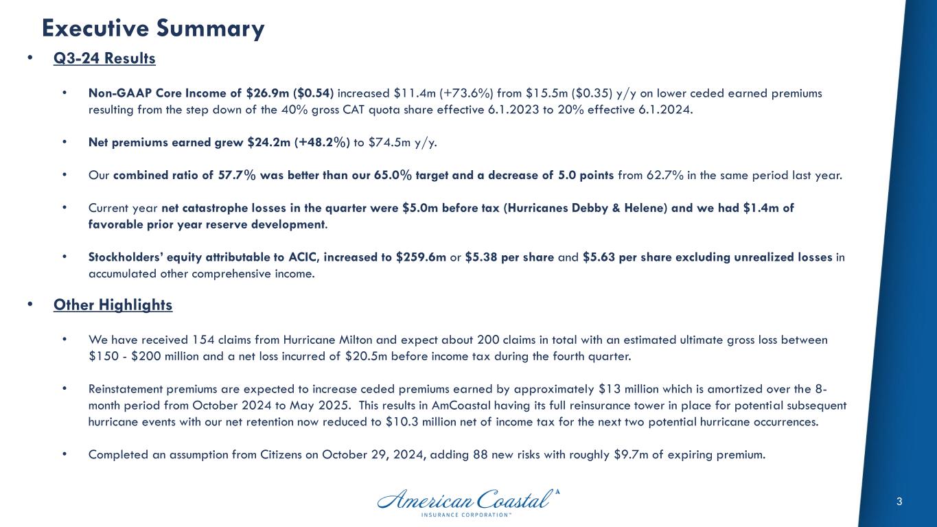 2 Company Overview ACIC is a specialty underwriter of catastrophe exposed property insurance. American Coastal Insurance Corp. (Nasdaq: ACIC) is the insurance holding company for two P&C carriers: American Coastal Insurance Company (AmCoastal) and Interboro Insurance Company (IIC) ¹ along with other operating affiliates. AmCoastal has the #1 market share of commercial residential property insurance (commercial lines) in Florida with roughly 4,000 policies and $646.0 million of premium in-force. IIC’s homeowners & fire insurance products (personal lines) are written exclusively in New York with approximately 18,800 policies and $38.7 million of premium in-force. ¹ ACIC as of September 30, 2024 Total Assets: $1.14 billion Total Equity: $259.6 million Annualized Revenue: $289.9 million Employees: 64 Headquarters: St. Petersburg, FL Credit Rating: BB+ (Kroll) Specialty Commercial Property Specialty Homeowners ¹ ¹ IIC ‘s results are classified as discontinued operations.