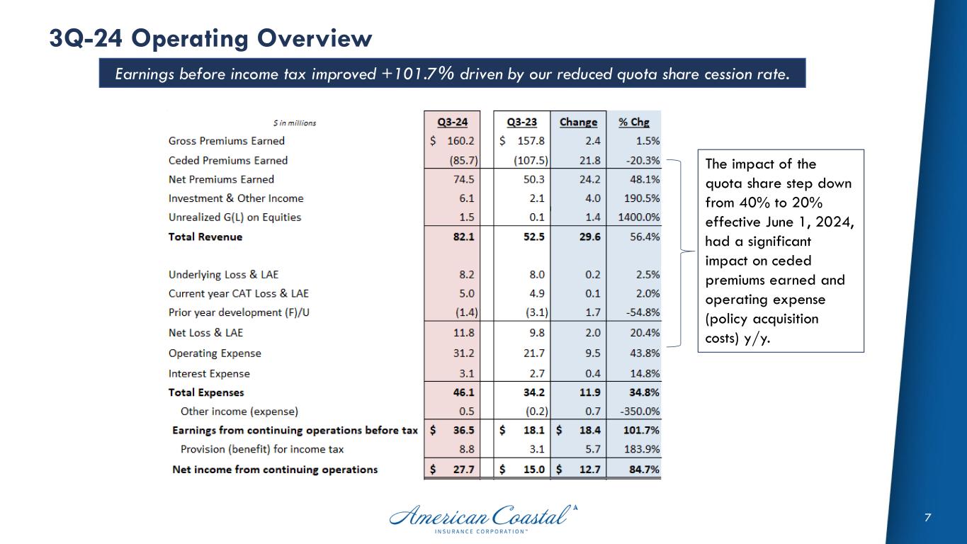 6 3Q-24 Summary of Key Results Combined ratio decreased 5.0 points and core income grew $11.4m ($0.19) due to higher net premiums.