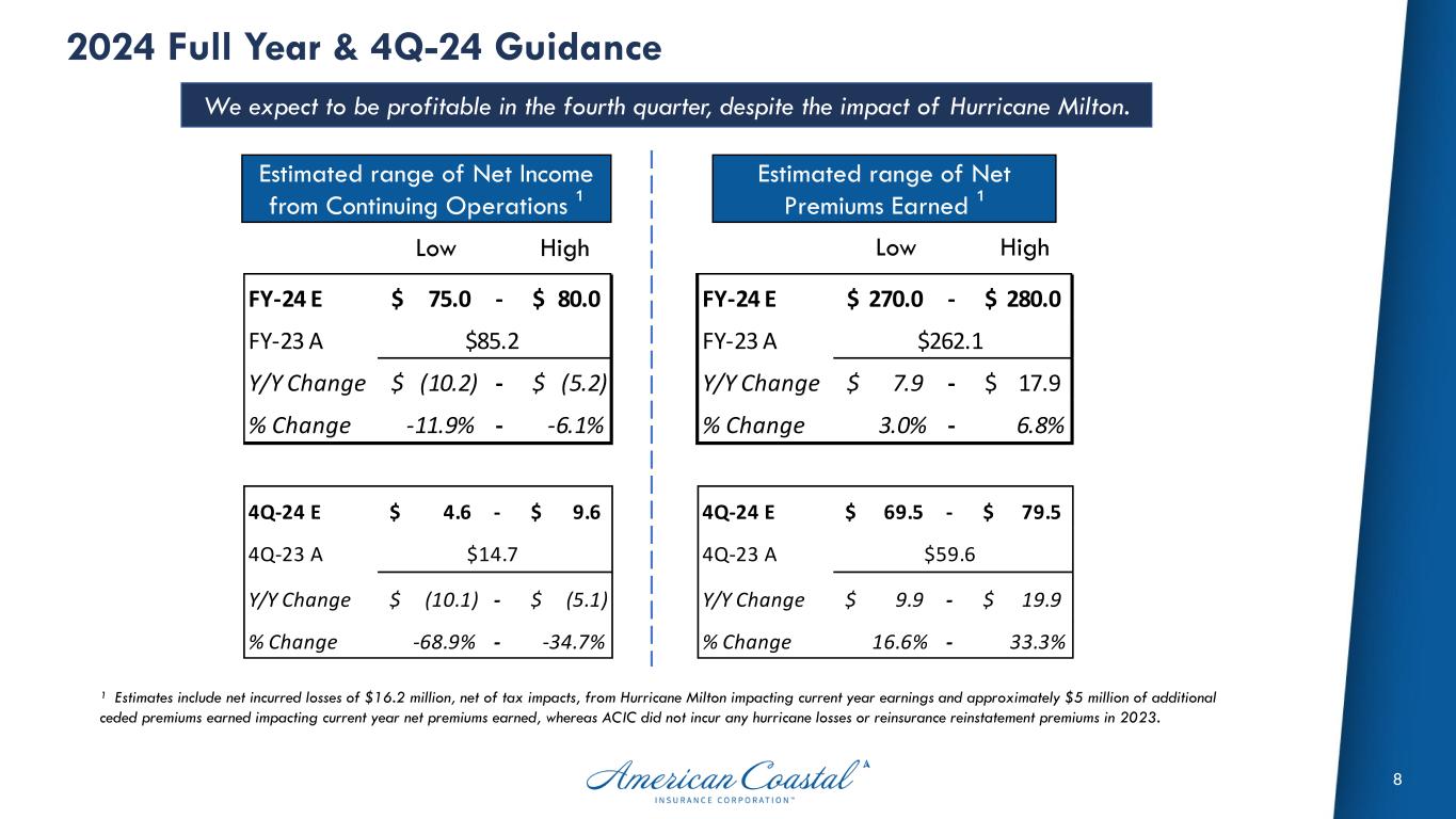 7 3Q-24 Operating Overview Earnings before income tax improved +101.7% driven by our reduced quota share cession rate. The impact of the quota share step down from 40% to 20% effective June 1, 2024, had a significant impact on ceded premiums earned and operating expense (policy acquisition costs) y/y.