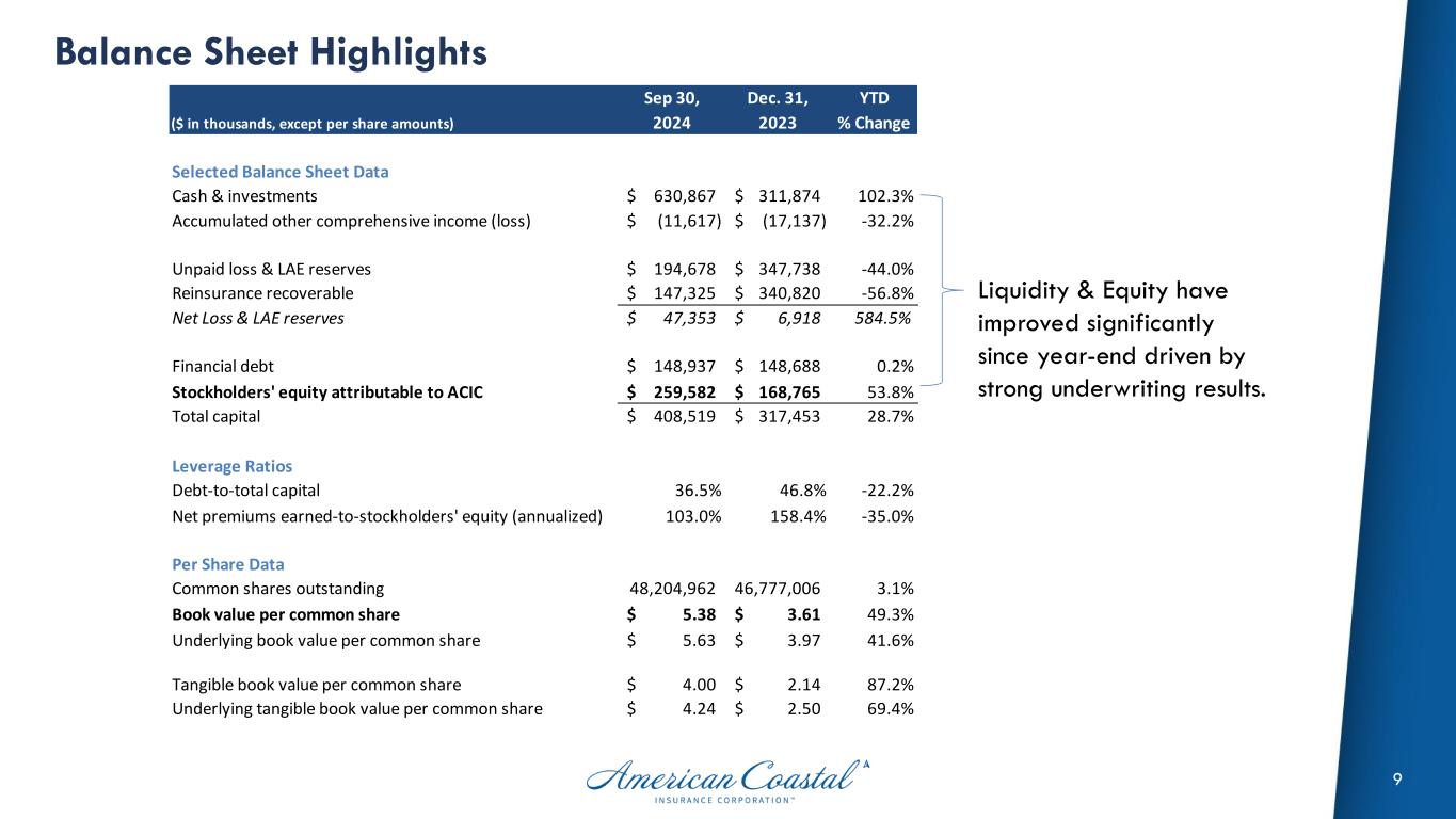 8 2024 Full Year & 4Q-24 Guidance We expect to be profitable in the fourth quarter, despite the impact of Hurricane Milton. Estimated range of Net Income from Continuing Operations ¹ Estimated range of Net Premiums Earned ¹ Low High Low High ¹ Estimates include net incurred losses of $16.2 million, net of tax impacts, from Hurricane Milton impacting current year earnings and approximately $5 million of additional ceded premiums earned impacting current year net premiums earned, whereas ACIC did not incur any hurricane losses or reinsurance reinstatement premiums in 2023. FY-24 E 75.0$ - 80.0$ FY-24 E 270.0$ - 280.0$ FY-23 A FY-23 A Y/Y Change (10.2)$ - (5.2)$ Y/Y Change 7.9$ - 17.9$ % Change -11.9% - -6.1% % Change 3.0% - 6.8% 4Q-24 E 4.6$ - 9.6$ 4Q-24 E 69.5$ - 79.5$ 4Q-23 A 4Q-23 A Y/Y Change (10.1)$ - (5.1)$ Y/Y Change 9.9$ - 19.9$ % Change -68.9% - -34.7% % Change 16.6% - 33.3% $85.2 $262.1 $59.6$14.7