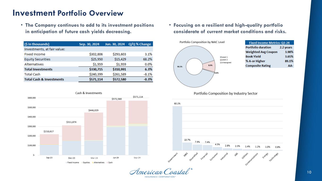 9 Balance Sheet Highlights Liquidity & Equity have improved significantly since year-end driven by strong underwriting results. Sep 30, Dec. 31, YTD ($ in thousands, except per share amounts) 2024 2023 % Change Selected Balance Sheet Data Cash & investments 630,867$ 311,874$ 102.3% Accumulated other comprehensive income (loss) (11,617)$ (17,137)$ -32.2% Unpaid loss & LAE reserves 194,678$ 347,738$ -44.0% Reinsurance recoverable 147,325$ 340,820$ -56.8% Net Loss & LAE reserves 47,353$ 6,918$ 584.5% Financial debt 148,937$ 148,688$ 0.2% Stockholders' equity attributable to ACIC 259,582$ 168,765$ 53.8% Total capital 408,519$ 317,453$ 28.7% Leverage Ratios Debt-to-total capital 36.5% 46.8% -22.2% Net premiums earned-to-stockholders' equity (annualized) 103.0% 158.4% -35.0% Per Share Data Common shares outstanding 48,204,962 46,777,006 3.1% Book value per common share 5.38$ 3.61$ 49.3% Underlying book value per common share 5.63$ 3.97$ 41.6% Tangible book value per common share 4.00$ 2.14$ 87.2% Underlying tangible book value per common share 4.24$ 2.50$ 69.4%