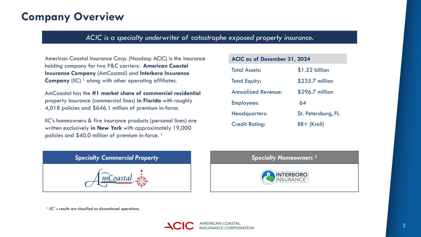 2 Company Overview ACIC is a specialty underwriter of catastrophe exposed property insurance. American Coastal Insurance Corp. (Nasdaq: ACIC) is the insurance holding company for two P&C carriers: American Coastal Insurance Company (AmCoastal) and Interboro Insurance Company (IIC) ¹ along with other operating affiliates. AmCoastal has the #1 market share of commercial residential property insurance (commercial lines) in Florida with roughly 4,018 policies and $646.1 million of premium in-force. IIC’s homeowners & fire insurance products (personal lines) are written exclusively in New York with approximately 19,000 policies and $40.0 million of premium in-force. ¹ ACIC as of December 31, 2024 Total Assets: $1.22 billion Total Equity: $235.7 million Annualized Revenue: $296.7 million Employees: 64 Headquarters: St. Petersburg, FL Credit Rating: BB+ (Kroll) Specialty Commercial Property Specialty Homeowners ¹ ¹ IIC ‘s results are classified as discontinued operations.