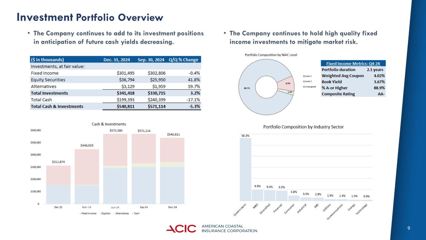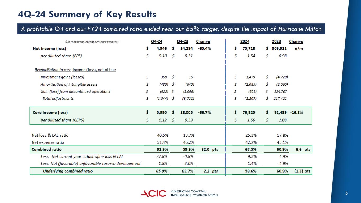 3 Executive Summary • Q4-24 Results • Non-GAAP Core Income of $6.0m ($0.12) decreased $12.0m (-66.7%) from $18.0m ($0.39) y/y on higher incurred losses resulting from Hurricane Milton and higher policy acquisition costs due to lower ceding commission income, offset by lower ceded earned premiums resulting from the step down of the 40% gross CAT quota share effective 6.1.2023 to 20% effective 6.1.2024. • Net premiums earned grew $24.4m (+49.7%) to $73.5m y/y. • Our combined ratio of 91.9% was impacted by Hurricane Milton, which drove 27.8 points of this ratio. Our Non-GAAP underlying combined ratio (which excludes current catastrophe losses and PY development) was 65.9%. FY24 ended with a combined ratio of 67.5%. • Current year net catastrophe losses in the quarter were $20.4m before tax (Hurricane Milton) and we had $1.3m of favorable prior year reserve development. • Stockholders’ equity attributable to ACIC, decreased $23.9 million from September 30, 2024, to $235.7m or $4.89 per share and $5.21 per share excluding unrealized losses in accumulated other comprehensive income. This was driven by the $0.50 special dividend declared during the fourth quarter. • Other Highlights • We successfully launched our new apartment product, having bound 19 policies with $2.3m of premium as of February 25, 2025. • Successful placement of an additional Catastrophe Bond effective December 20, 2024, which was oversubscribed and provides an additional $200 million in cascading coverage up to a third event. • In addition to the renewal of our January 1, 2025, AOP CAT and February 1, 2025, Excess Per Risk programs at a lower risk-adjusted cost, we placed a new catastrophe aggregate excess of loss agreement (CAT AGG), providing $40m of aggregate limit excess of $40m from all catastrophe perils for the full year ending December 31, 2025 to reduce potential earnings volatility from increased frequency.