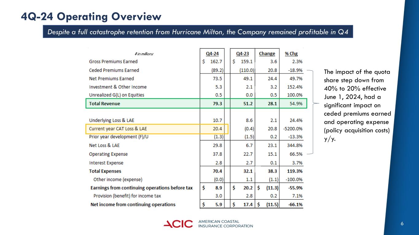 5 4Q-24 Summary of Key Results A profitable Q4 and our FY24 combined ratio ended near our 65% target, despite the impact of Hurricane Milton