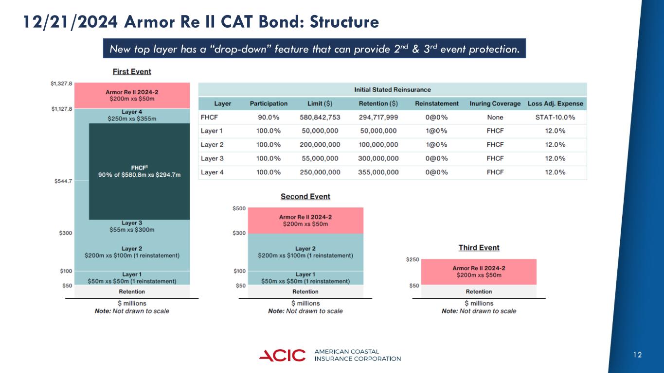 12 12/21/2024 Armor Re II CAT Bond: Structure New top layer has a “drop-down” feature that can provide 2nd & 3rd event protection.