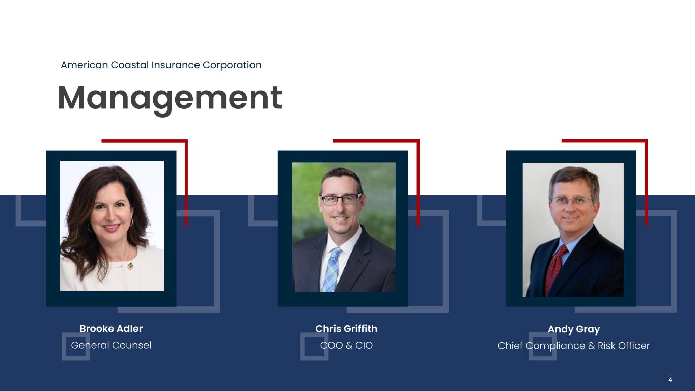 Management American Coastal Insurance Corporation Dan Peed Executive Chairman & Former CEO Brad Martz President & CEO Lana Castle CFO 3
