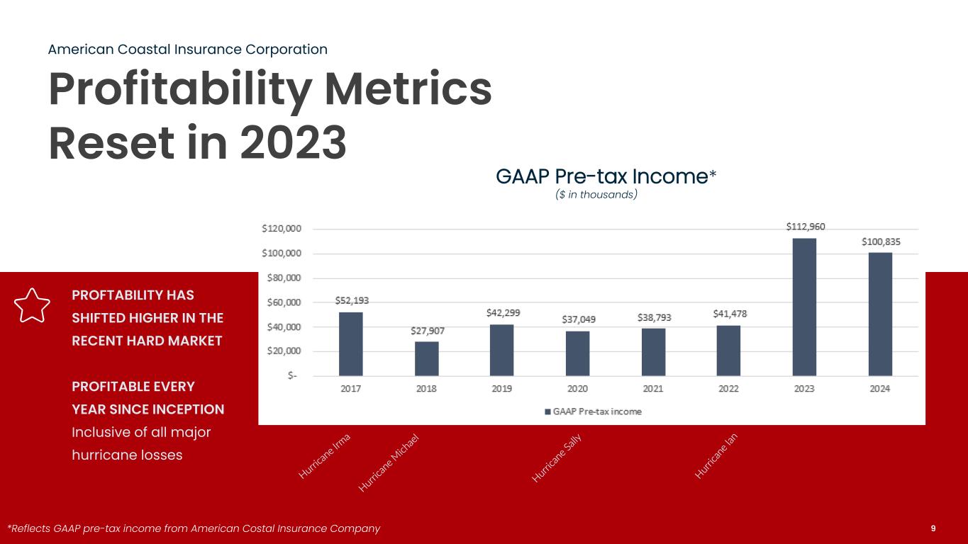 Investment Thesis American Coastal Insurance Corporation Deep Underwriting Expertise Sophisticated multi-model underwriting & best-in-industry data capture capabilities. 08 :0 0 Recently Completed Strategic Transformation A compelling investment opportunity in a unique niche market. Favorable Market Conditions Compounding rate increases YOY, positioning ACIC for future profitable growth. AmRisc – an Exclusive Partnership The leading commercial property managing general agent (MGA) in the U.S. Above-average Risk Characteristics Focusing on low-rise and garden-style condominium buildings. Consistent Profitability ¹ Pre-tax income (10-year average) of $55.4 M with an attritional loss & LAE ratio of 8.1%. Strong Reinsurance Support Low retention minimizes potential volatility from potential hurricane losses. ¹ GAAP results for AmCoastal only 8