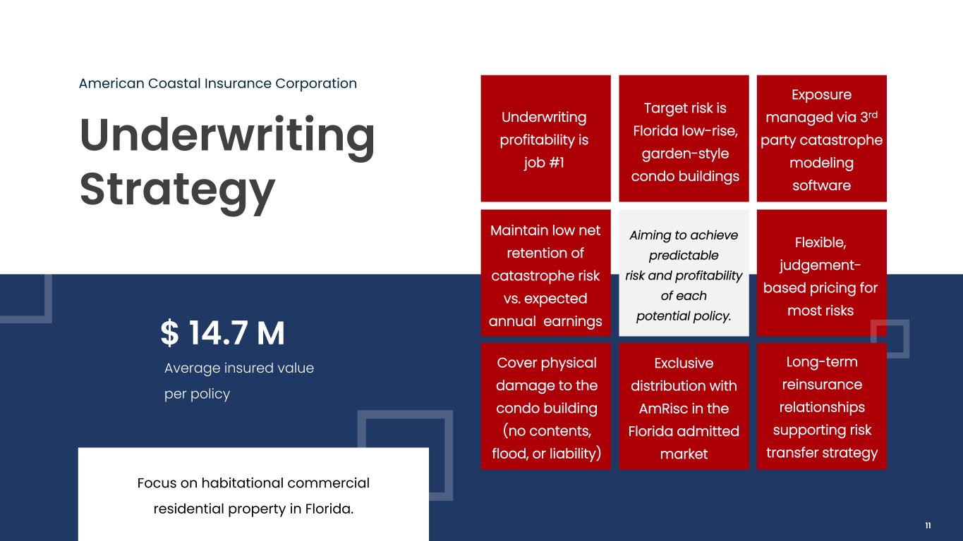 Exclusive Partnership American Coastal Insurance Corporation 6th largest insurance broker in the U.S. 7th largest insurance broker in the world Exclusive MGA Agreement for the Admitted Commercial Residential Condominium Association Market in Florida Distribution, underwriting, policy issuance, inspection, claims services and portfolio management AmRisc was founded by ACIC Executive Chairman and Former CEO, Dan Peed, in 2000. American Coastal provides underwriting strategy, direction and pricing targets to AmRisc. 10