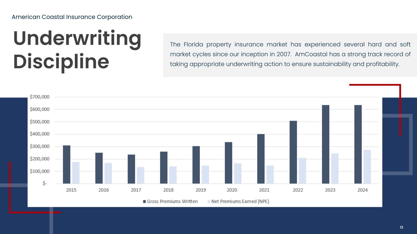 Underwriting profitability is job #1 Target risk is Florida low-rise, garden-style condo buildings Exposure managed via 3rd party catastrophe modeling software Maintain low net retention of catastrophe risk vs. expected annual earnings Aiming to achieve predictable risk and profitability of each potential policy. Flexible, judgement- based pricing for most risks Cover physical damage to the condo building (no contents, flood, or liability) Exclusive distribution with AmRisc in the Florida admitted market Long-term reinsurance relationships supporting risk transfer strategy Underwriting Strategy American Coastal Insurance Corporation $ 14.7 M Average insured value per policy Focus on habitational commercial residential property in Florida. 11