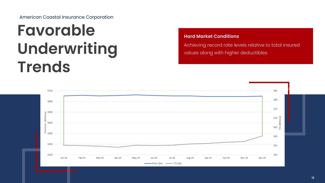 Underwriting Discipline American Coastal Insurance Corporation The Florida property insurance market has experienced several hard and soft market cycles since our inception in 2007. AmCoastal has a strong track record of taking appropriate underwriting action to ensure sustainability and profitability. Soft Market = Risk Off Hard Market = Risk On 12