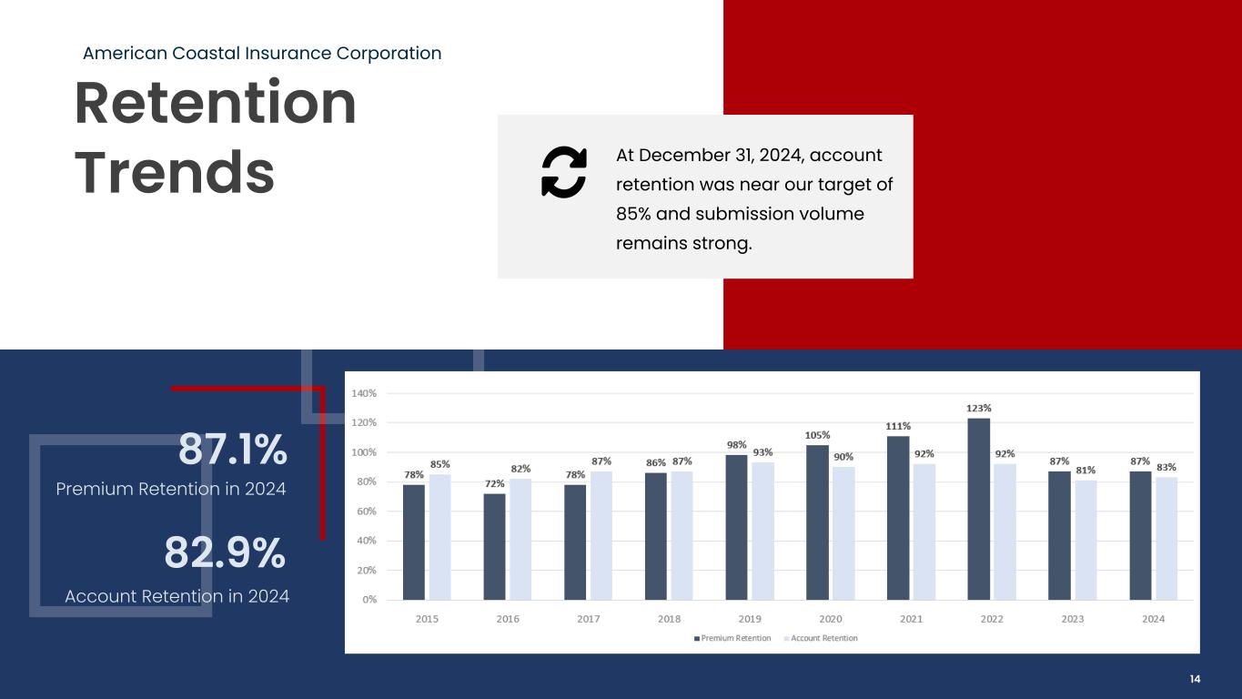 Retention Trends American Coastal Insurance Corporation At December 31, 2024, account retention was near our target of 85% and submission volume remains strong. 87.1% Premium Retention in 2024 82.9% Account Retention in 2024 14