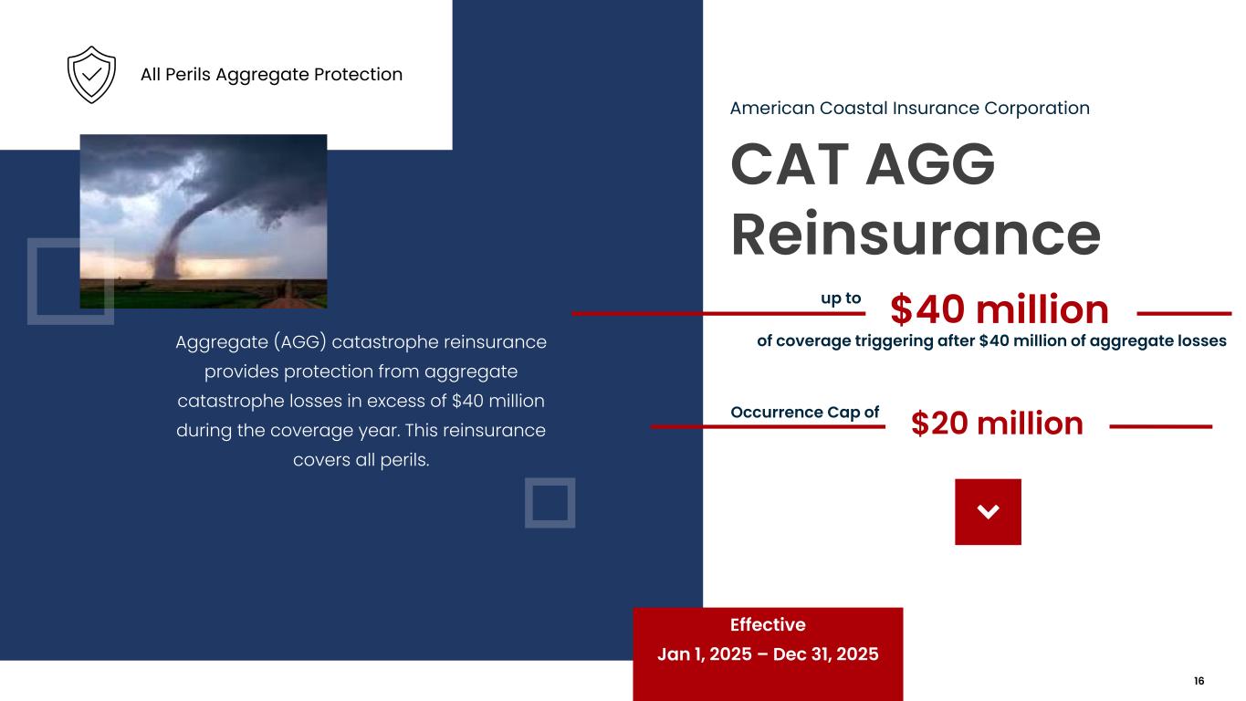 CAT AGG Reinsurance American Coastal Insurance Corporation Aggregate (AGG) catastrophe reinsurance provides protection from aggregate catastrophe losses in excess of $40 million during the coverage year. This reinsurance covers all perils. $40 millionup to Effective Jan 1, 2025 – Dec 31, 2025 All Perils Aggregate Protection of coverage triggering after $40 million of aggregate losses $20 millionOccurrence Cap of 16