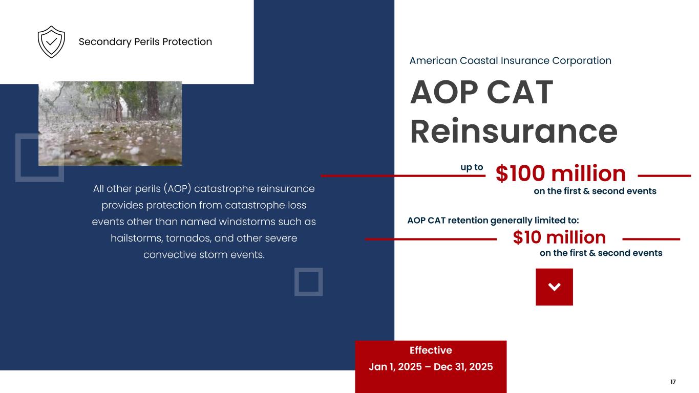 AOP CAT Reinsurance American Coastal Insurance Corporation All other perils (AOP) catastrophe reinsurance provides protection from catastrophe loss events other than named windstorms such as hailstorms, tornados, and other severe convective storm events. $100 millionup to Effective Jan 1, 2025 – Dec 31, 2025 Secondary Perils Protection on the first & second events $10 million AOP CAT retention generally limited to: on the first & second events 17