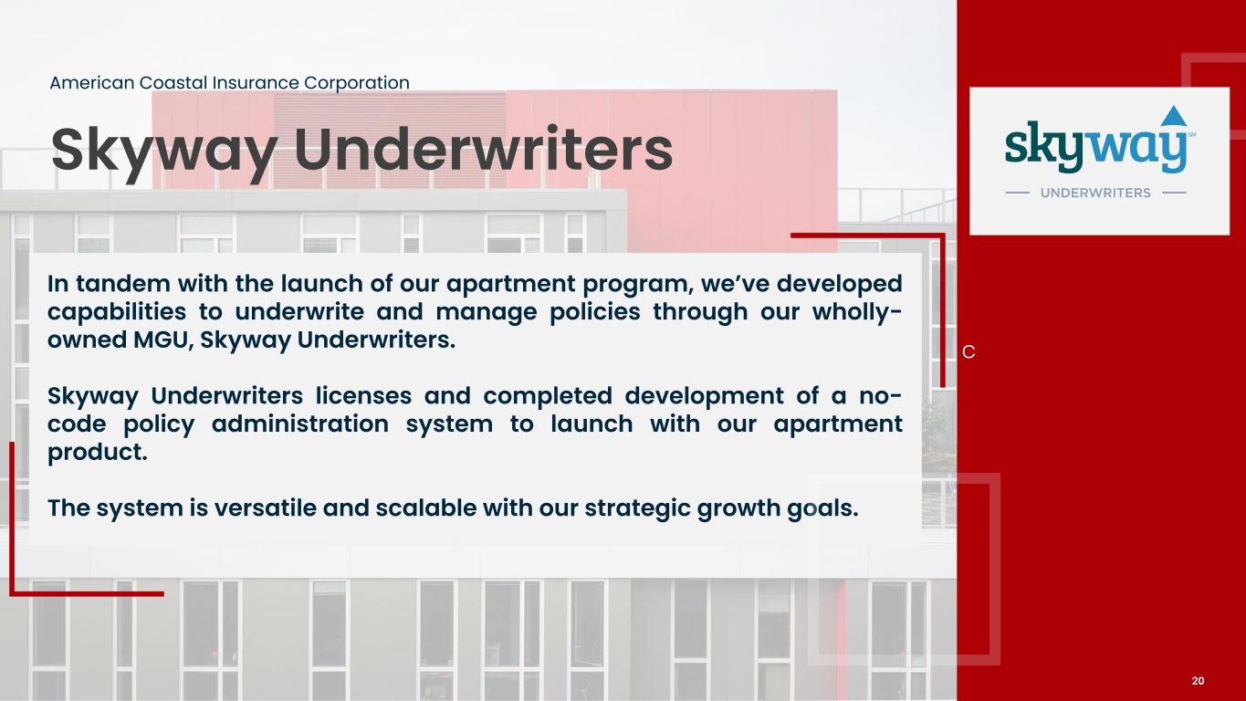 New Apartment Program American Coastal Insurance Corporation On October 27, 2024, we completed our first Citizens assumption, assuming 87 policies with approximately $10.7 million of expiring premium. This includes 14 apartment policies, kicking off our new apartment program. Similar to our Condo book of business, we plan to target garden style apartment buildings and complexes, with a TIV of $5 million to $65 million. Distribution through wholesale brokerage channels, with underwriting and policy management through our wholly-owned MGU, Skyway Underwriters. We believe these risks belong in the admitted market, not the E&S market that most reside in today. $20 millionApproximately of written premiums in 2025 $100 to $200 millionMarket Opportunity of in annual premium by Year 5. 19