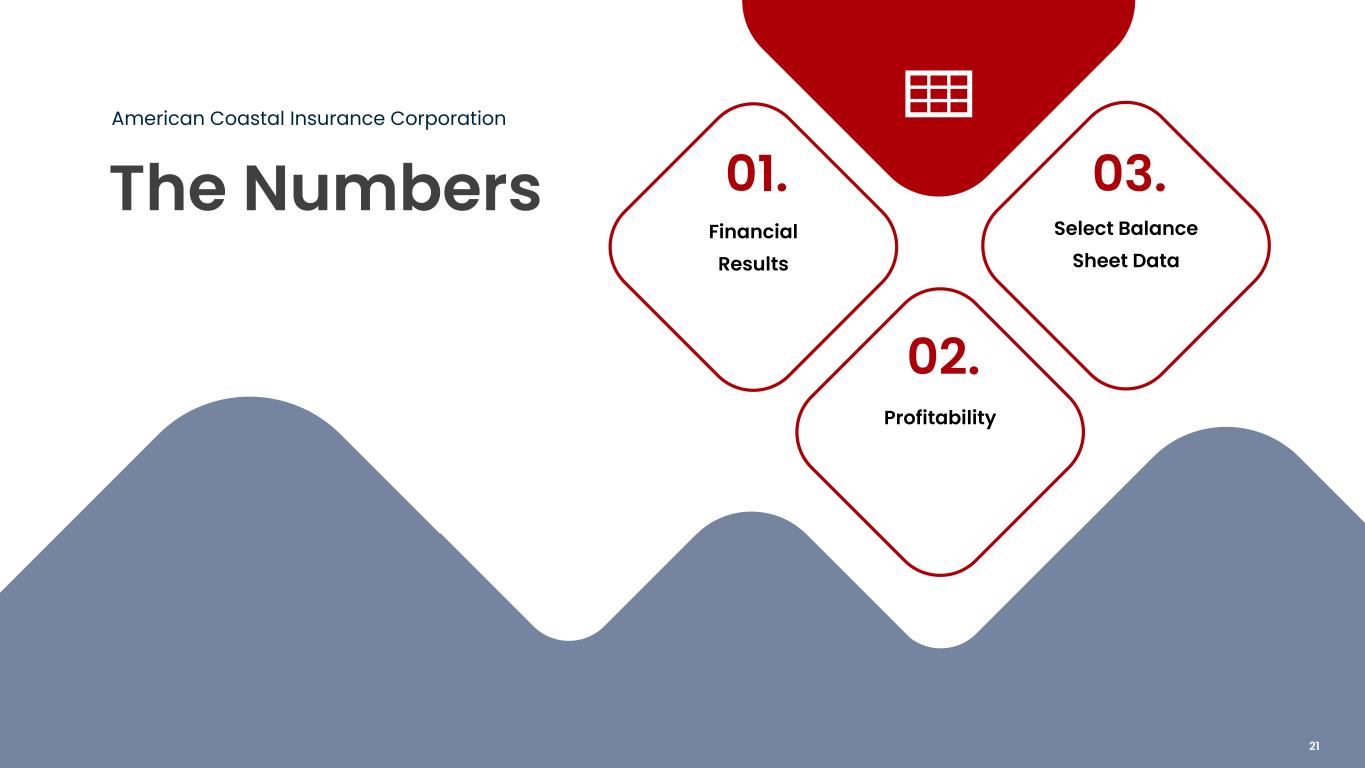The Numbers Financial Results Profitability Select Balance Sheet Data 01. 02. 03. American Coastal Insurance Corporation 21