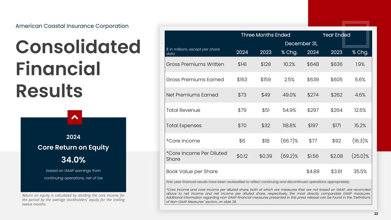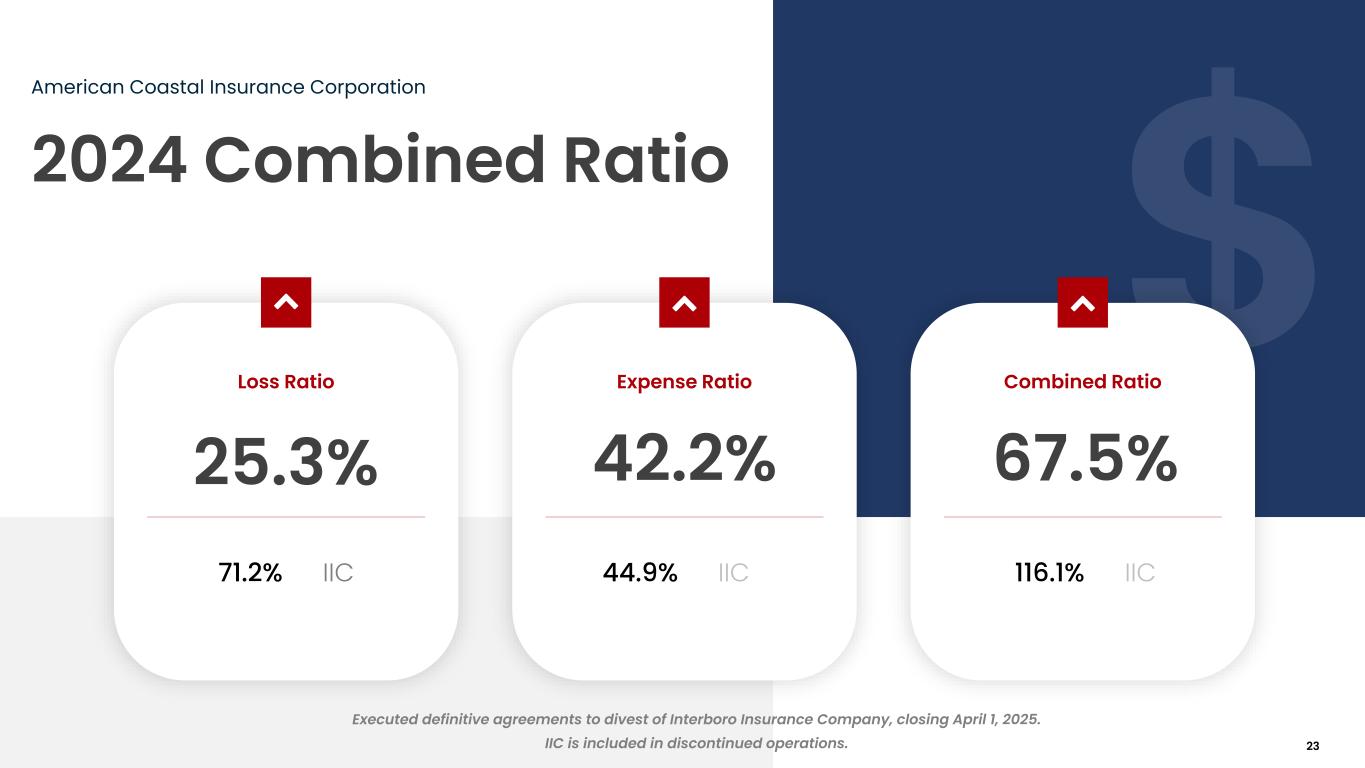 Consolidated Financial Results American Coastal Insurance Corporation $ in millions, except per share data Three Months Ended Year Ended December 31, 2024 2023 % Chg. 2024 2023 % Chg. Gross Premiums Written $141 $128 10.2% $648 $636 1.9% Gross Premiums Earned $163 $159 2.5% $639 $605 5.6% Net Premiums Earned $73 $49 49.0% $274 $262 4.6% Total Revenue $79 $51 54.9% $297 $264 12.5% Total Expenses $70 $32 118.8% $197 $171 15.2% *Core Income $6 $18 (66.7)% $77 $92 (16.3)% *Core Income Per Diluted Share $0.12 $0.39 (69.2)% $1.56 $2.08 (25.0)% Book Value per Share $4.89 $3.61 35.5% Prior year financial results have been reclassified to reflect continuing and discontinued operations appropriately. *Core income and core income per diluted share, both of which are measures that are not based on GAAP, are reconciled above to net income and net income per diluted share, respectively, the most directly comparable GAAP measures. Additional information regarding non-GAAP financial measures presented in this press release can be found in the "Definitions of Non-GAAP Measures" section, on slide 28. 2024 Core Return on Equity 34.0% based on GAAP earnings from continuing operations, net of tax Return on equity is calculated by dividing the core income for the period by the average stockholders' equity for the trailing twelve months. 22