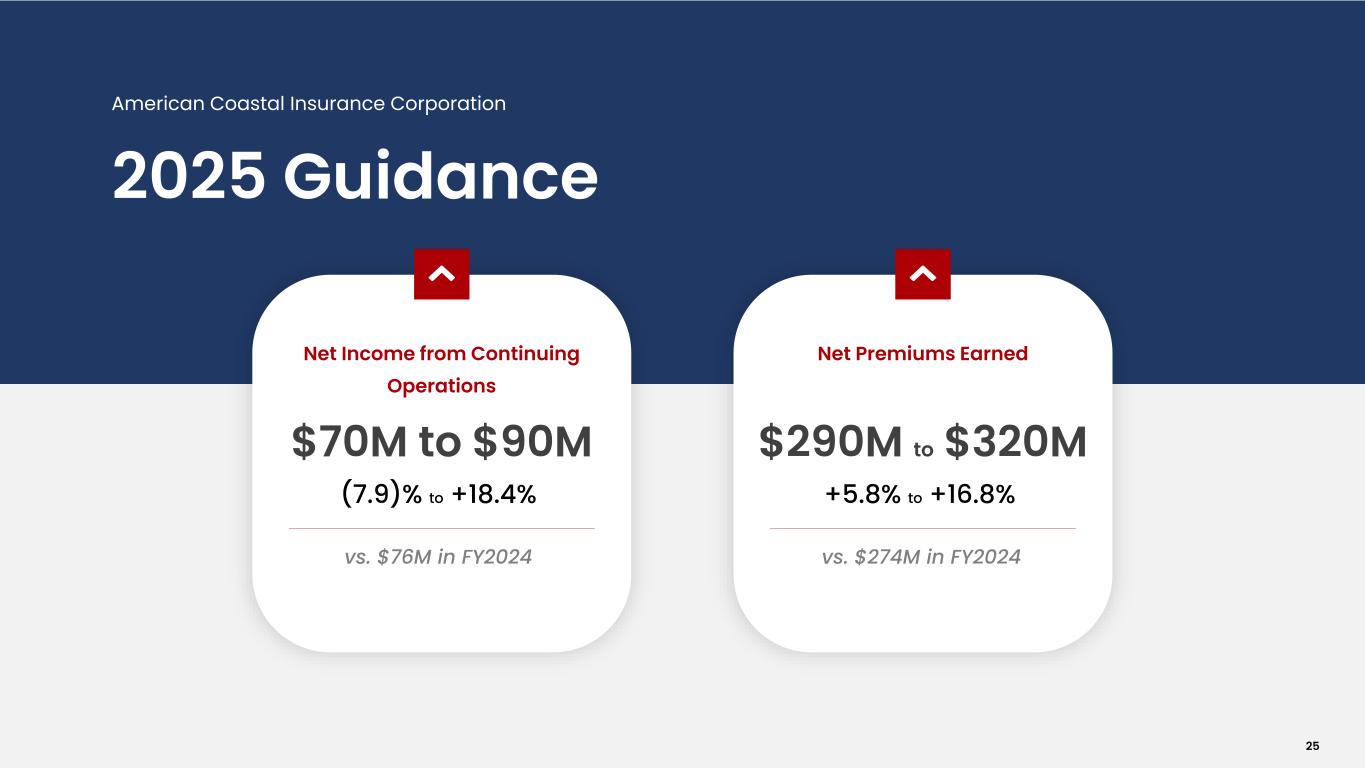 Select Balance Sheet Data American Coastal Insurance Corporation Improving Capitalization = Growth Opportunity We have resumed underwriting new commercial business after several years of shrinking due to capital constraints. $ in millions December 31, 2024 December 31, 2023 Total Investments $341 $155 Cash and Cash Equivalents $137 $139 Cash & Investments $540 $294 Total Assets $1,216 $1,062 Unpaid Losses & LAE $322 $348 Notes Payable $149 $149 Total Liabilities $980 $894 Total Stockholders’ Equity $236 $169 Total Liabilities and Stockholders' Equity $1,216 $1,062 Consolidated Balance Sheet components have been reclassified to reflect continuing and discontinued operations appropriately. 24