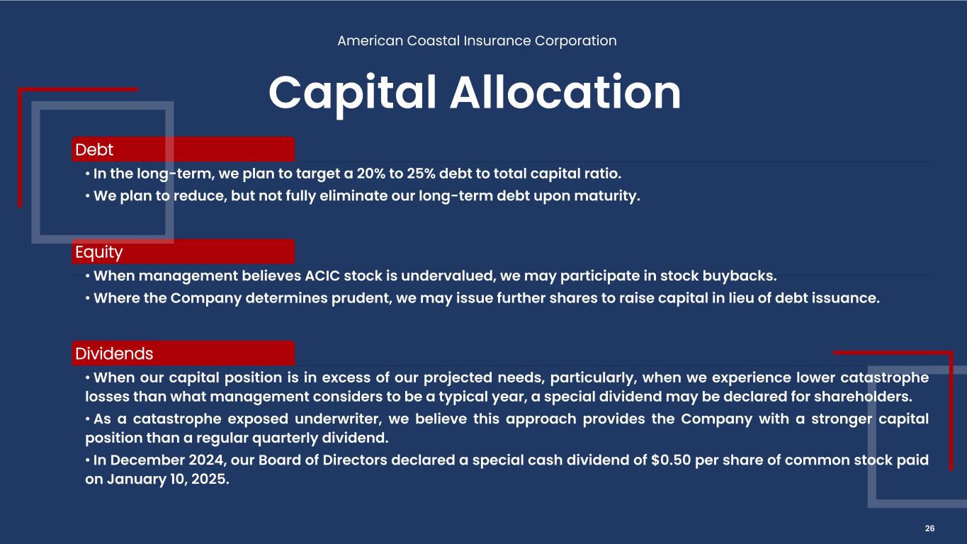 Debt • In the long-term, we plan to target a 20% to 25% debt to total capital ratio. • We plan to reduce, but not fully eliminate our long-term debt upon maturity. Equity • When management believes ACIC stock is undervalued, we may participate in stock buybacks. • Where the Company determines prudent, we may issue further shares to raise capital in lieu of debt issuance. Dividends • When our capital position is in excess of our projected needs, particularly, when we experience lower catastrophe losses than what management considers to be a typical year, a special dividend may be declared for shareholders. • As a catastrophe exposed underwriter, we believe this approach provides the Company with a stronger capital position than a regular quarterly dividend. • In December 2024, our Board of Directors declared a special cash dividend of $0.50 per share of common stock paid on January 10, 2025. Capital Allocation American Coastal Insurance Corporation 26