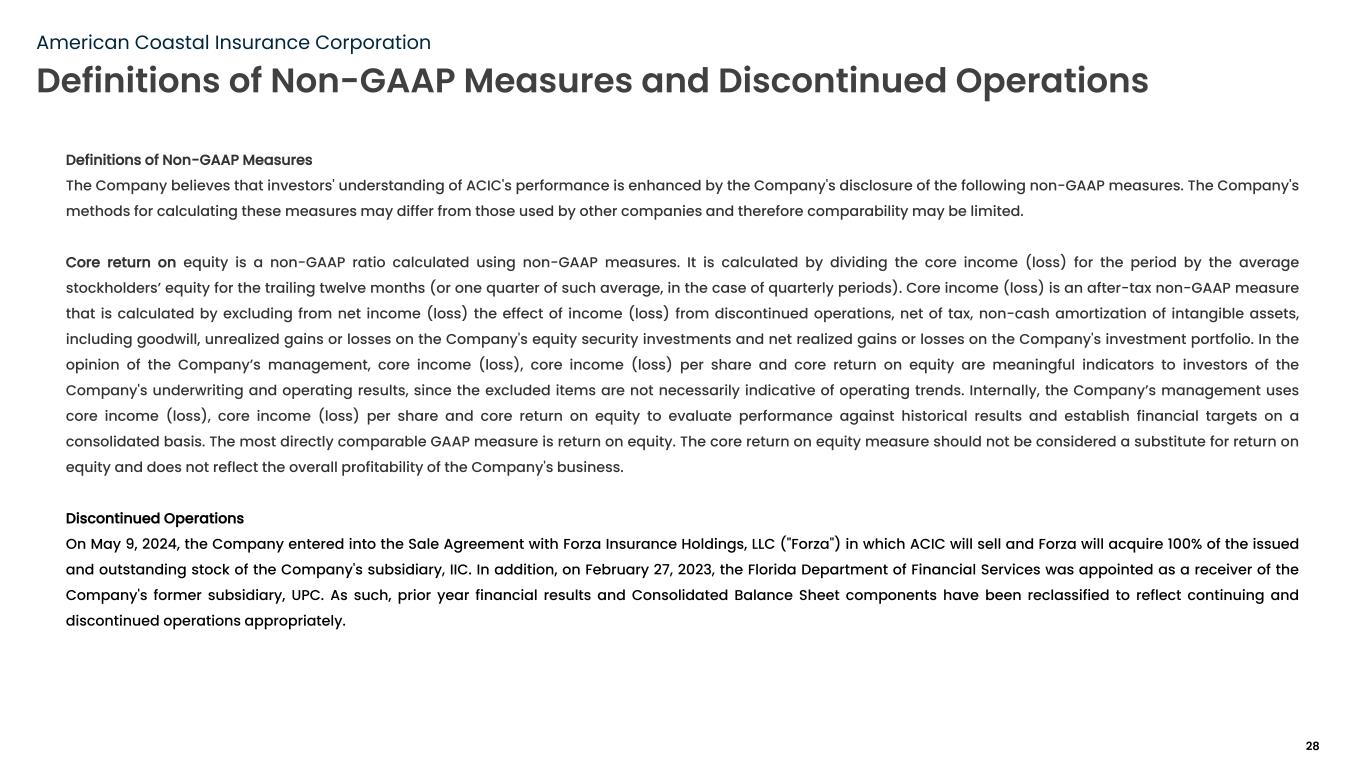 Definitions of Non-GAAP Measures The Company believes that investors' understanding of ACIC's performance is enhanced by the Company's disclosure of the following non-GAAP measures. The Company's methods for calculating these measures may differ from those used by other companies and therefore comparability may be limited. Core return on equity is a non-GAAP ratio calculated using non-GAAP measures. It is calculated by dividing the core income (loss) for the period by the average stockholders’ equity for the trailing twelve months (or one quarter of such average, in the case of quarterly periods). Core income (loss) is an after-tax non-GAAP measure that is calculated by excluding from net income (loss) the effect of income (loss) from discontinued operations, net of tax, non-cash amortization of intangible assets, including goodwill, unrealized gains or losses on the Company's equity security investments and net realized gains or losses on the Company's investment portfolio. In the opinion of the Company’s management, core income (loss), core income (loss) per share and core return on equity are meaningful indicators to investors of the Company's underwriting and operating results, since the excluded items are not necessarily indicative of operating trends. Internally, the Company’s management uses core income (loss), core income (loss) per share and core return on equity to evaluate performance against historical results and establish financial targets on a consolidated basis. The most directly comparable GAAP measure is return on equity. The core return on equity measure should not be considered a substitute for return on equity and does not reflect the overall profitability of the Company's business. Discontinued Operations On May 9, 2024, the Company entered into the Sale Agreement with Forza Insurance Holdings, LLC ("Forza") in which ACIC will sell and Forza will acquire 100% of the issued and outstanding stock of the Company's subsidiary, IIC. In addition, on February 27, 2023, the Florida Department of Financial Services was appointed as a receiver of the Company's former subsidiary, UPC. As such, prior year financial results and Consolidated Balance Sheet components have been reclassified to reflect continuing and discontinued operations appropriately. American Coastal Insurance Corporation Definitions of Non-GAAP Measures and Discontinued Operations 28