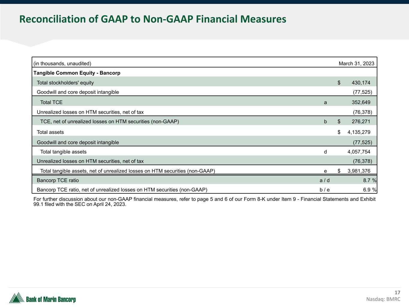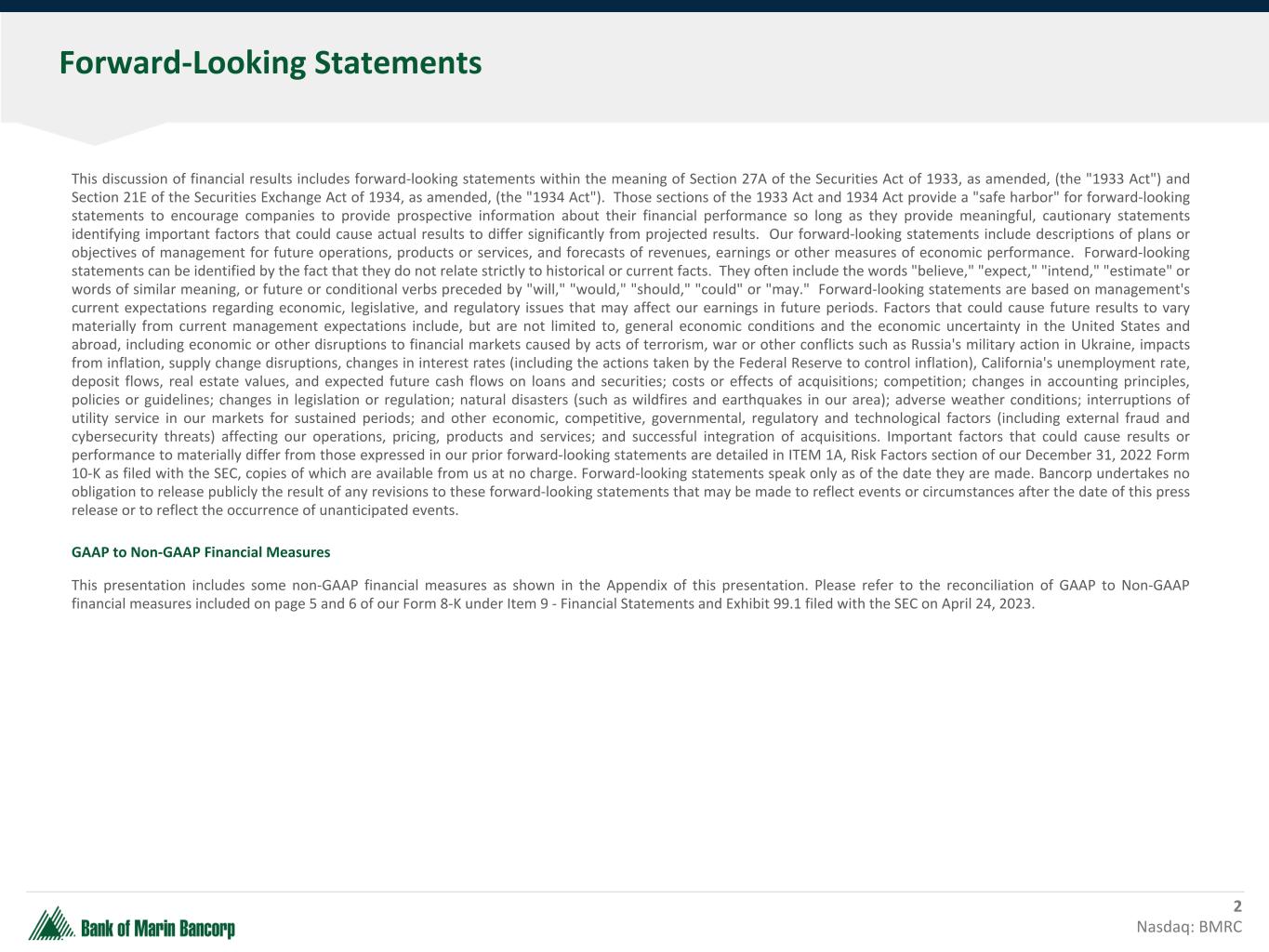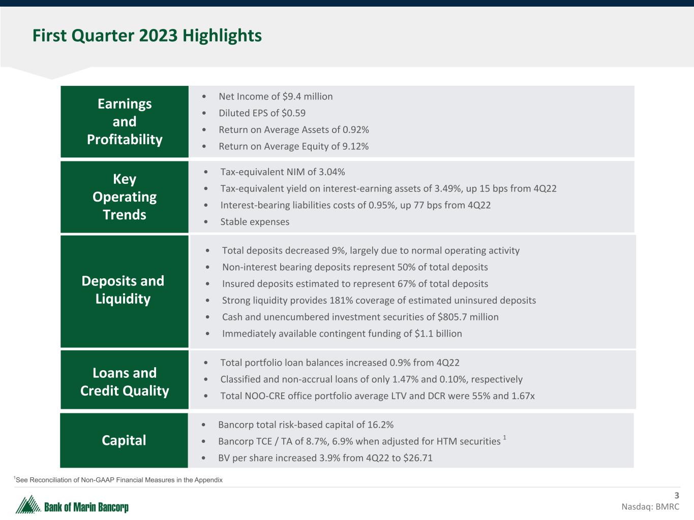 2 Nasdaq: BMRC Forward-Looking Statements This discussion of financial results includes forward-looking statements within the meaning of Section 27A of the Securities Act of 1933, as amended, (the "1933 Act") and Section 21E of the Securities Exchange Act of 1934, as amended, (the "1934 Act"). Those sections of the 1933 Act and 1934 Act provide a "safe harbor" for forward-looking statements to encourage companies to provide prospective information about their financial performance so long as they provide meaningful, cautionary statements identifying important factors that could cause actual results to differ significantly from projected results. Our forward-looking statements include descriptions of plans or objectives of management for future operations, products or services, and forecasts of revenues, earnings or other measures of economic performance. Forward-looking statements can be identified by the fact that they do not relate strictly to historical or current facts. They often include the words "believe," "expect," "intend," "estimate" or words of similar meaning, or future or conditional verbs preceded by "will," "would," "should," "could" or "may." Forward-looking statements are based on management's current expectations regarding economic, legislative, and regulatory issues that may affect our earnings in future periods. Factors that could cause future results to vary materially from current management expectations include, but are not limited to, general economic conditions and the economic uncertainty in the United States and abroad, including economic or other disruptions to financial markets caused by acts of terrorism, war or other conflicts such as Russia's military action in Ukraine, impacts from inflation, supply change disruptions, changes in interest rates (including the actions taken by the Federal Reserve to control inflation), California's unemployment rate, deposit flows, real estate values, and expected future cash flows on loans and securities; costs or effects of acquisitions; competition; changes in accounting principles, policies or guidelines; changes in legislation or regulation; natural disasters (such as wildfires and earthquakes in our area); adverse weather conditions; interruptions of utility service in our markets for sustained periods; and other economic, competitive, governmental, regulatory and technological factors (including external fraud and cybersecurity threats) affecting our operations, pricing, products and services; and successful integration of acquisitions. Important factors that could cause results or performance to materially differ from those expressed in our prior forward-looking statements are detailed in ITEM 1A, Risk Factors section of our December 31, 2022 Form 10-K as filed with the SEC, copies of which are available from us at no charge. Forward-looking statements speak only as of the date they are made. Bancorp undertakes no obligation to release publicly the result of any revisions to these forward-looking statements that may be made to reflect events or circumstances after the date of this press release or to reflect the occurrence of unanticipated events. GAAP to Non-GAAP Financial Measures This presentation includes some non-GAAP financial measures as shown in the Appendix of this presentation. Please refer to the reconciliation of GAAP to Non-GAAP financial measures included on page 5 and 6 of our Form 8-K under Item 9 - Financial Statements and Exhibit 99.1 filed with the SEC on April 24, 2023.