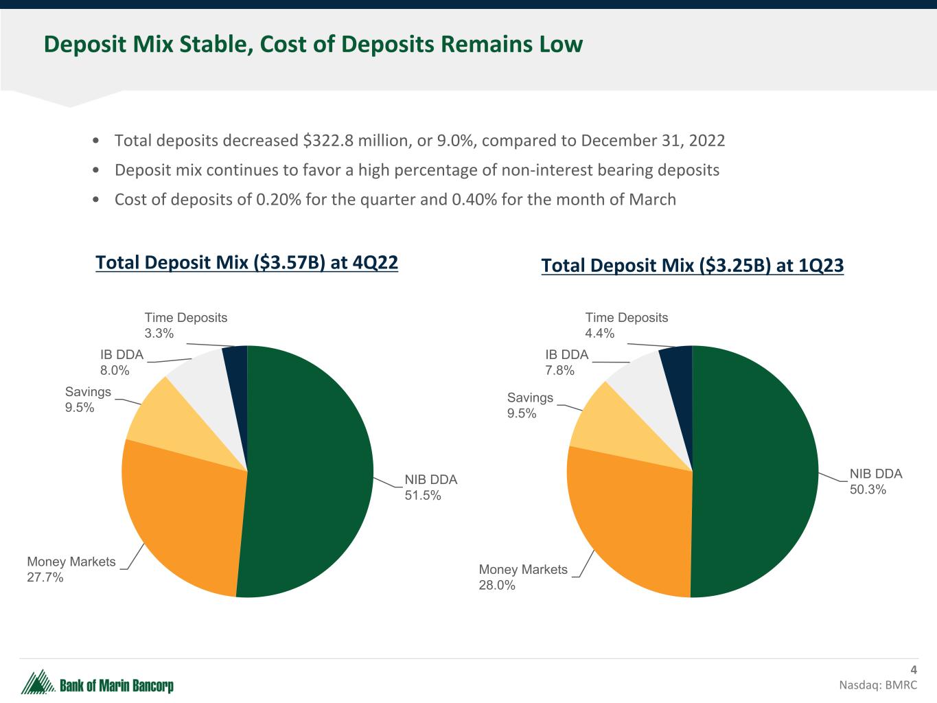 First Quarter 2023 Highlights 3 Nasdaq: BMRC Earnings and Profitability • Net Income of $9.4 million • Diluted EPS of $0.59 • Return on Average Assets of 0.92% • Return on Average Equity of 9.12% Key Operating Trends Loans and Credit Quality Deposits and Liquidity Capital • Tax-equivalent NIM of 3.04% • Tax-equivalent yield on interest-earning assets of 3.49%, up 15 bps from 4Q22 • Interest-bearing liabilities costs of 0.95%, up 77 bps from 4Q22 • Stable expenses • Total portfolio loan balances increased 0.9% from 4Q22 • Classified and non-accrual loans of only 1.47% and 0.10%, respectively • Total NOO-CRE office portfolio average LTV and DCR were 55% and 1.67x • Total deposits decreased 9%, largely due to normal operating activity • Non-interest bearing deposits represent 50% of total deposits • Insured deposits estimated to represent 67% of total deposits • Strong liquidity provides 181% coverage of estimated uninsured deposits • Cash and unencumbered investment securities of $805.7 million • Immediately available contingent funding of $1.1 billion • Bancorp total risk-based capital of 16.2% • Bancorp TCE / TA of 8.7%, 6.9% when adjusted for HTM securities 1 • BV per share increased 3.9% from 4Q22 to $26.71 1See Reconciliation of Non-GAAP Financial Measures in the Appendix