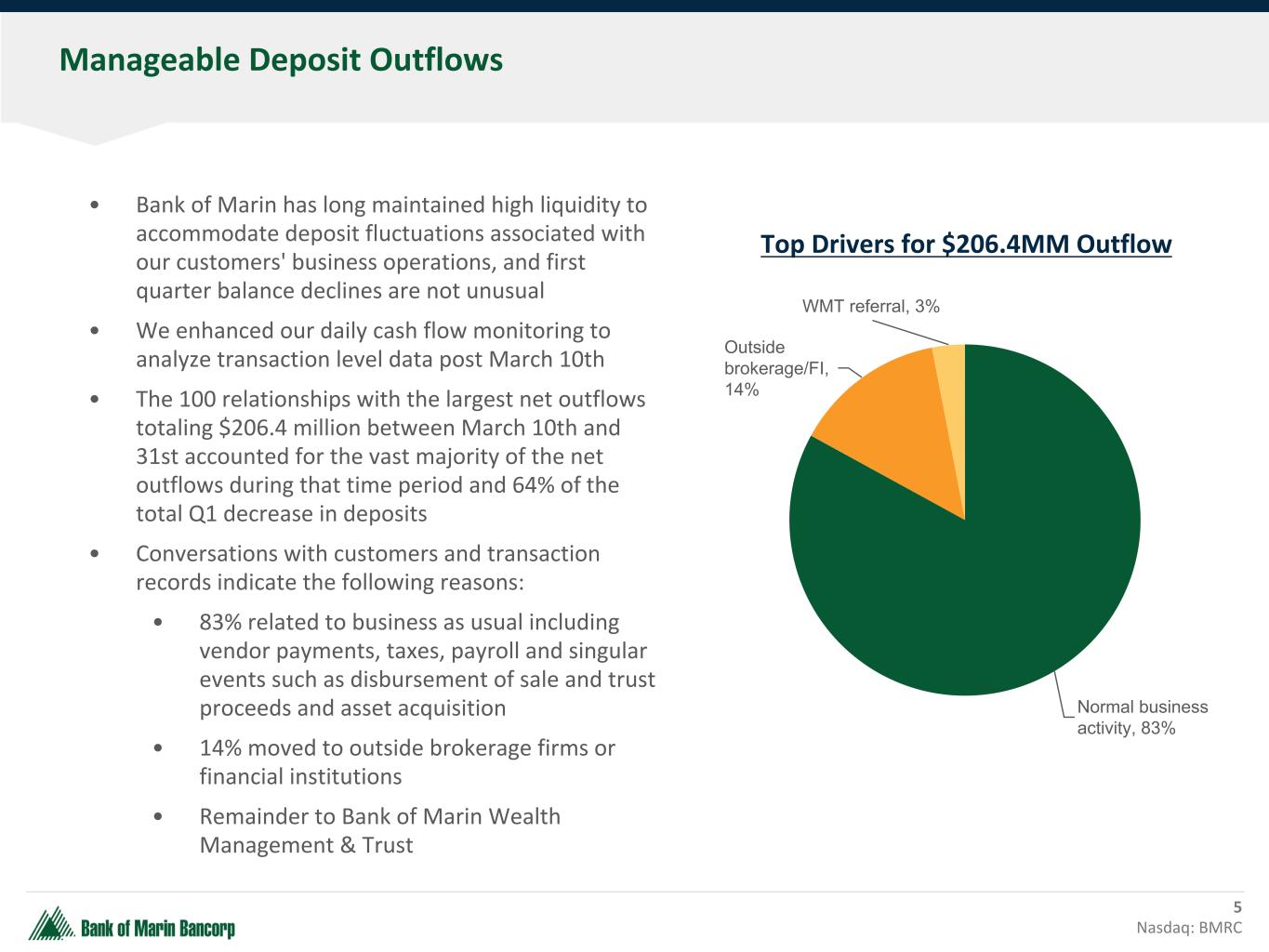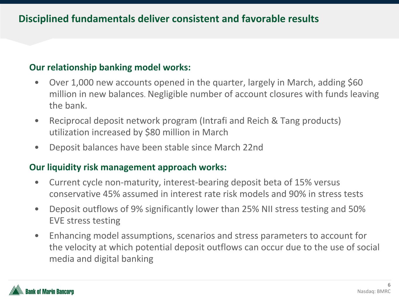 Manageable Deposit Outflows 5 Nasdaq: BMRC • Bank of Marin has long maintained high liquidity to accommodate deposit fluctuations associated with our customers' business operations, and first quarter balance declines are not unusual • We enhanced our daily cash flow monitoring to analyze transaction level data post March 10th • The 100 relationships with the largest net outflows totaling $206.4 million between March 10th and 31st accounted for the vast majority of the net outflows during that time period and 64% of the total Q1 decrease in deposits • Conversations with customers and transaction records indicate the following reasons: • 83% related to business as usual including vendor payments, taxes, payroll and singular events such as disbursement of sale and trust proceeds and asset acquisition • 14% moved to outside brokerage firms or financial institutions • Remainder to Bank of Marin Wealth Management & Trust Normal business activity, 83% Outside brokerage/FI, 14% WMT referral, 3% Top Drivers for $206.4MM Outflow