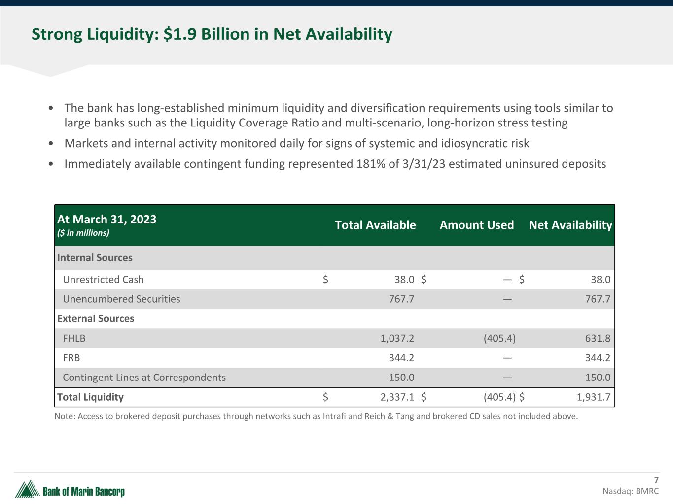Disciplined fundamentals deliver consistent and favorable results 6 Nasdaq: BMRC Our relationship banking model works: • Over 1,000 new accounts opened in the quarter, largely in March, adding $60 million in new balances. Negligible number of account closures with funds leaving the bank. • Reciprocal deposit network program (Intrafi and Reich & Tang products) utilization increased by $80 million in March • Deposit balances have been stable since March 22nd Our liquidity risk management approach works: • Current cycle non-maturity, interest-bearing deposit beta of 15% versus conservative 45% assumed in interest rate risk models and 90% in stress tests • Deposit outflows of 9% significantly lower than 25% NII stress testing and 50% EVE stress testing • Enhancing model assumptions, scenarios and stress parameters to account for the velocity at which potential deposit outflows can occur due to the use of social media and digital banking