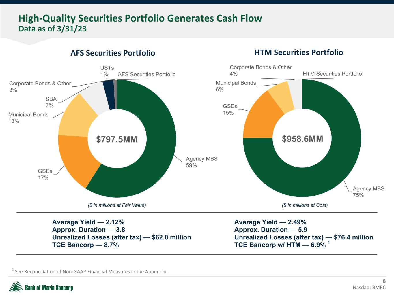 Strong Liquidity: $1.9 Billion in Net Availability 7 Nasdaq: BMRC At March 31, 2023 ($ in millions) Total Available Amount Used Net Availability Internal Sources Unrestricted Cash $ 38.0 $ — $ 38.0 Unencumbered Securities 767.7 — 767.7 External Sources FHLB 1,037.2 (405.4) 631.8 FRB 344.2 — 344.2 Contingent Lines at Correspondents 150.0 — 150.0 Total Liquidity $ 2,337.1 $ (405.4) $ 1,931.7 • The bank has long-established minimum liquidity and diversification requirements using tools similar to large banks such as the Liquidity Coverage Ratio and multi-scenario, long-horizon stress testing • Markets and internal activity monitored daily for signs of systemic and idiosyncratic risk • Immediately available contingent funding represented 181% of 3/31/23 estimated uninsured deposits Note: Access to brokered deposit purchases through networks such as Intrafi and Reich & Tang and brokered CD sales not included above.