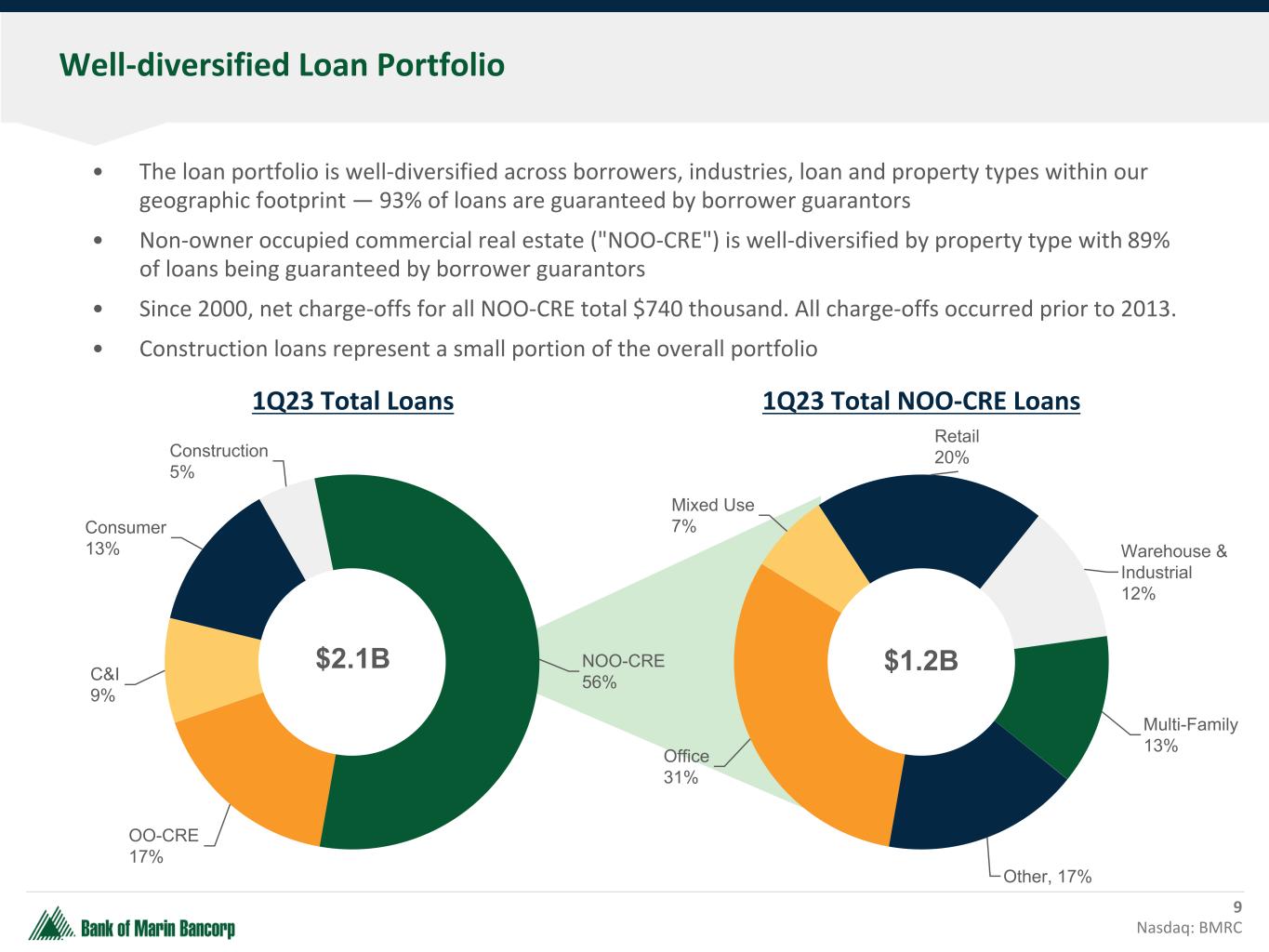 HTM Securities Portfolio HTM Securities Portfolio Agency MBS 75% GSEs 15% Municipal Bonds 6% Corporate Bonds & Other 4% AFS Securities Portfolio AFS Securities Portfolio Agency MBS 59% GSEs 17% Municipal Bonds 13% SBA 7% Corporate Bonds & Other 3% USTs 1% High-Quality Securities Portfolio Generates Cash Flow Data as of 3/31/23 8 Nasdaq: BMRC $797.5MM $958.6MM Average Yield — 2.12% Approx. Duration — 3.8 Unrealized Losses (after tax) — $62.0 million TCE Bancorp — 8.7% Average Yield — 2.49% Approx. Duration — 5.9 Unrealized Losses (after tax) — $76.4 million TCE Bancorp w/ HTM — 6.9% 1 ($ in millions at Fair Value) ($ in millions at Cost) 1 See Reconciliation of Non-GAAP Financial Measures in the Appendix.