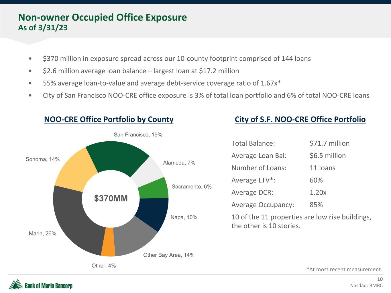 Well-diversified Loan Portfolio 9 Nasdaq: BMRC • The loan portfolio is well-diversified across borrowers, industries, loan and property types within our geographic footprint — 93% of loans are guaranteed by borrower guarantors • Non-owner occupied commercial real estate ("NOO-CRE") is well-diversified by property type with 89% of loans being guaranteed by borrower guarantors • Since 2000, net charge-offs for all NOO-CRE total $740 thousand. All charge-offs occurred prior to 2013. • Construction loans represent a small portion of the overall portfolio OO-CRE 17% C&I 9% Consumer 13% Construction 5% NOO-CRE 56% Office 31% Mixed Use 7% Retail 20% Warehouse & Industrial 12% Multi-Family 13% Other, 17% 1Q23 Total Loans 1Q23 Total NOO-CRE Loans $2.1B $1.2B